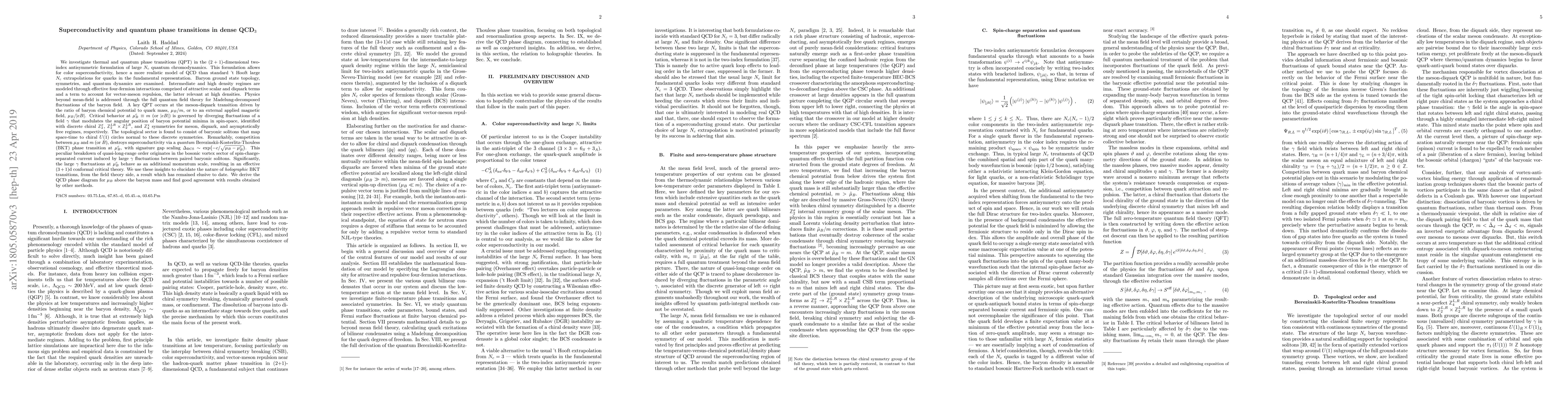 We present a new perspective on thermal and quantum phase transitions (QPT) in $(2+1)$-dimensional quantum chromodynamics based on symmetries, topology, and quantum dynamical structure of the baryon ground state in the large $N_c$ limit for quarks in the two-index antisymmetric representation. The intermediate and high density regimes are modeled through effective four-fermion interactions, which include attractive scalar and diquark terms, with a term to account for vector meson repulsion at high densities. We address beyond-mean-field phenomena by constructing the quantum field theory for fluctuations in internal degrees of freedom of the baryon ground state using a Madelung decomposition. A key QPT occurs at the meson-diquark transition driven by the ratio of baryon chemical potential to quark mass, $\mu_B/m$, or to an external applied magnetic field, $\mu_B/|eB|$. Properties of the system at ${\mu^c_B} \equiv m, |eB|$ stem from diverging quantum fluctuations of a continuous field $\gamma$ that modulates the spin-space angular positions of baryon potential minima, identified with discrete chiral $\mathbb{Z}_2^\sigma$, $\mathbb{Z}_2^{LR} \times \mathbb{Z}_2^{LR}$, and $\mathbb{Z}_4^\chi$ symmetries for meson, diquark, and asymptotically free regimes. Remarkably, competition between $\mu_B$ and $m$ (or $B$), destroys superconductivity via a \emph{quantum} Berezinskii-Kosterlitz-Thouless (BKT) phase transition at ${\mu^c_B}$. Moreover, the large $\gamma$ fluctuations at ${\mu^c_B }$ behave as an additional momentum scale, resulting in an effective $(3+1)$d conformal critical theory there. We use these insights to elucidate the nature of \emph{holographic} BKT transitions, from the field theory side, a result which has remained elusive to date. We derive the QCD phase diagram for $\mu_B$ above the baryon mass and find good agreement with results obtained by other methods.