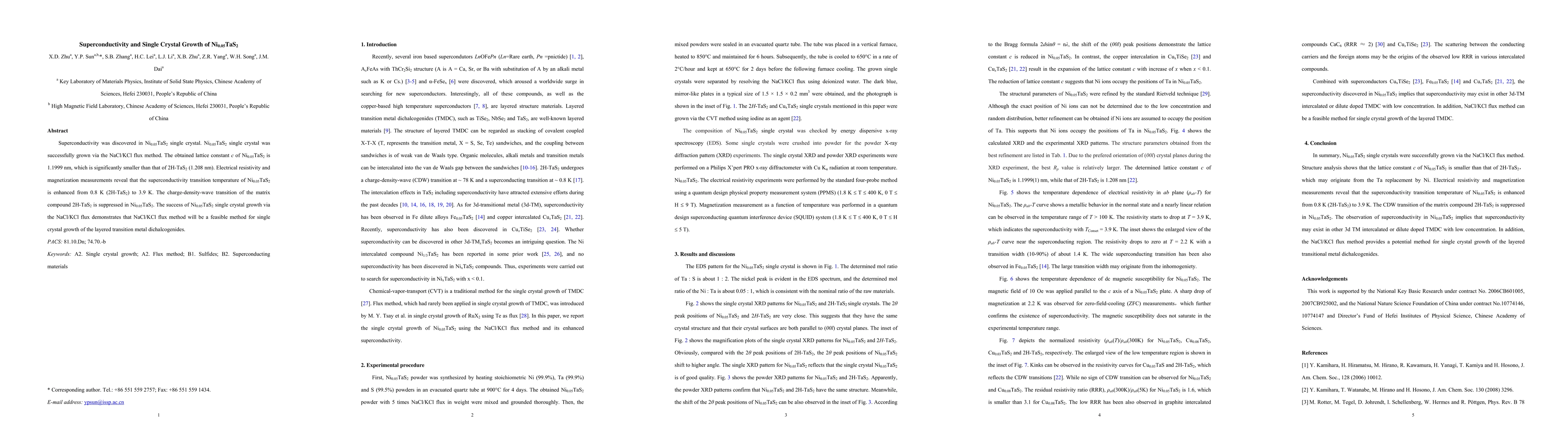 Researchers successfully grew a single crystal of Ni0:05TaS2 using the NaCl/KCl flux method, discovering superconductivity at 3.9 K, significantly higher than in its parent compound 2H-TaS2.