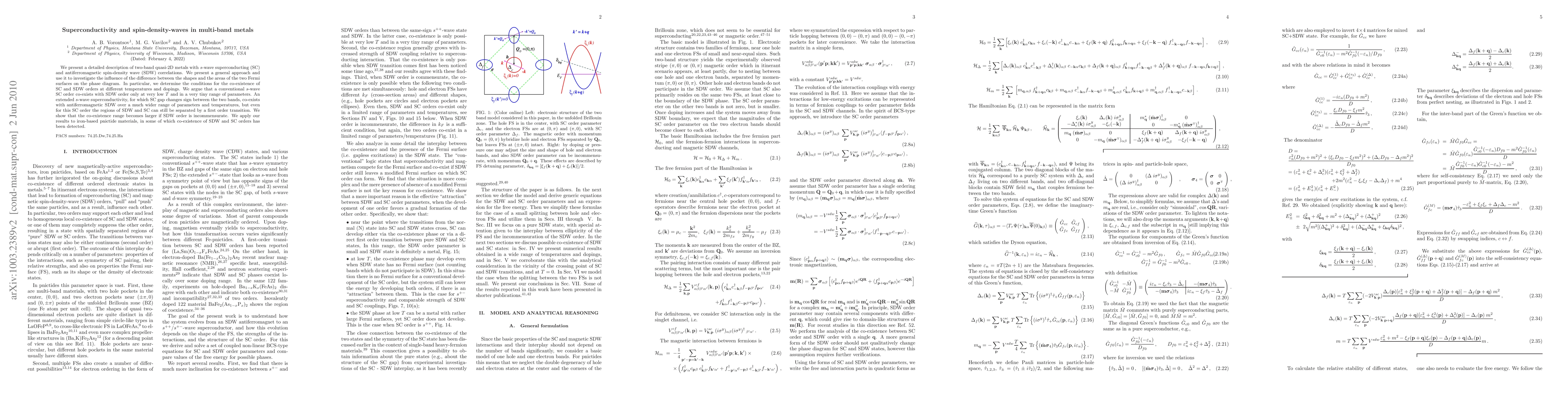Researchers investigate how two-band metals can exhibit both superconductivity and spin-density waves, finding that conventional s-wave superconductivity co-exists with SDW orders only at very low temperatures, while extended s-wave superconductivity co-exists with antiferromagnetic SDW over a wider range of parameters.