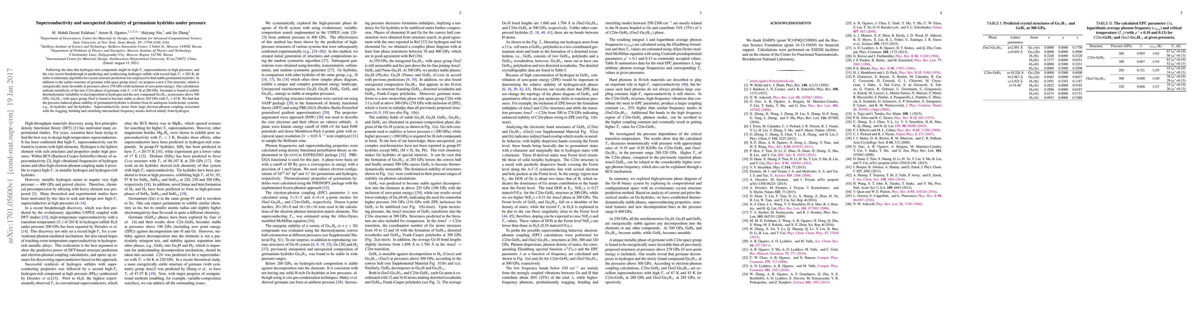 Following the idea that hydrogen-rich compounds might be high-T$_c$ superconductors at high pressures, and the very recent breakthrough in predicting and synthesizing hydrogen sulfide with record-high T$_c$ = 203 K, ab initio evolutionary algorithm for crystal structure prediction was employed to find stable germanium hydrides. In addition to the earlier structure of germane with space group Ama2, we propose a new C2/m structure, which is energetically more favorable at pressures above 278 GPa (with inclusion of zero point energy). Our calculations indicate metallicity of the new C2/m phase of germane with T$_c$ = 67 K at 280 GPa. Germane is found to exhibit thermodynamic instability to decomposition to hydrogen and the new compound Ge$_3$H$_{11}$ at pressures above 300 GPa. Ge$_3$H$_{11}$ with space group I$\bar{4}$m2 is found to become stable at above 285 GPa with T$_c$ = 43 K. We find that the pressure-induced phase stability of germanium hydrides is distinct from its analogous isoelectronic systems, e.g., Si-hydrides and Sn-hydrides. Superconductivity stems from large electron-phonon coupling associated with the wagging, bending and stretching intermediate-frequency modes derived mainly from hydrogen.