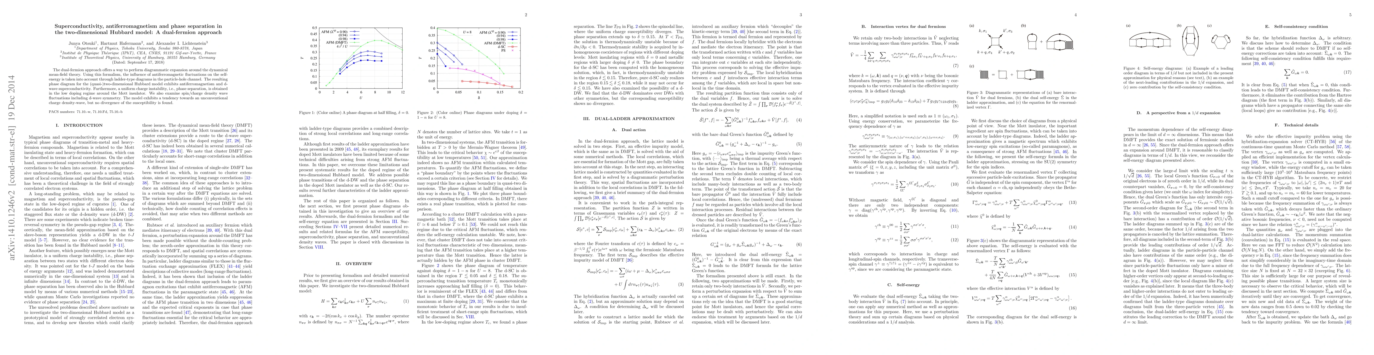 The dual-fermion approach offers a way to perform diagrammatic expansion around the dynamical mean-field theory. Using this formalism, the influence of antiferromagnetic fluctuations on the self-energy is taken into account through ladder-type diagrams in the particle-hole channel. The resulting phase diagram for the (quasi-)two-dimensional Hubbard model exhibits antiferromagnetism and d-wave superconductivity. Furthermore, a uniform charge instability, i.e., phase separation, is obtained in the low doping regime around the Mott insulator. We also examine spin/charge density wave fluctuations including d-wave symmetry. The model exhibits a tendency towards an unconventional charge density-wave, but no divergence of the susceptibility is found.