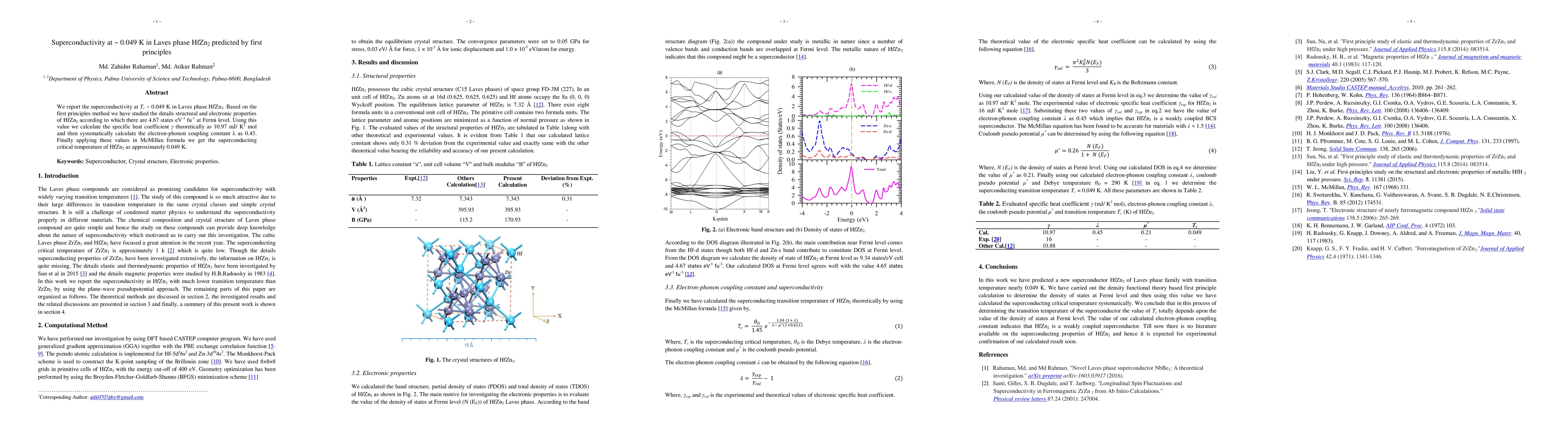 This research reports the discovery of superconductivity in Laves phase HfZn2 at a critical temperature of ~0.049 K. Utilizing first principles calculations, the study determines the electronic properties and electron-phonon coupling constant, leading to the prediction of this low-temperature superconductivity.
