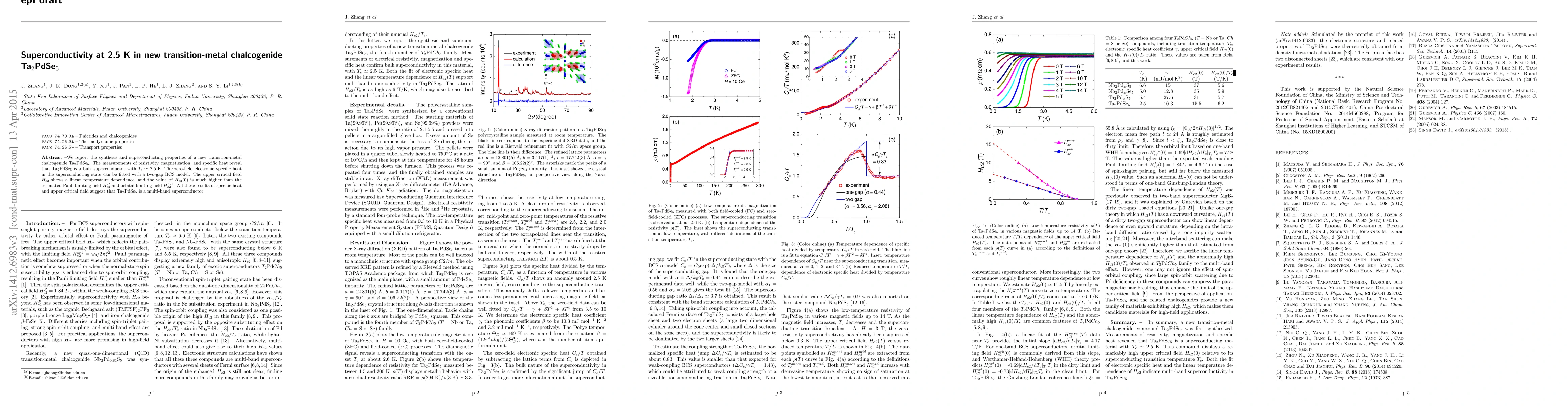 We report the synthesis and superconducting properties of a new transition-metal chalcogenide Ta$_2$PdSe$_5$. The measurements of resistivity, magnetization, and specific heat reveal that Ta$_2$PdSe$_5$ is a bulk superconductor with $T_c$ $\simeq$ 2.5 K. The zero-field electronic specific heat in the superconducting state can be fitted with a two-gap BCS model. The upper critical field $H_{c2}$ shows a linear temperature dependence, and the value of $H_{c2}$(0) is much higher than the estimated Pauli limiting field $H_{c2}^{P}$ and orbital limiting field $H_{c2}^{orb}$. All these results of specific heat and upper critical field suggest that Ta$_2$PdSe$_5$ is a multi-band superconductor.