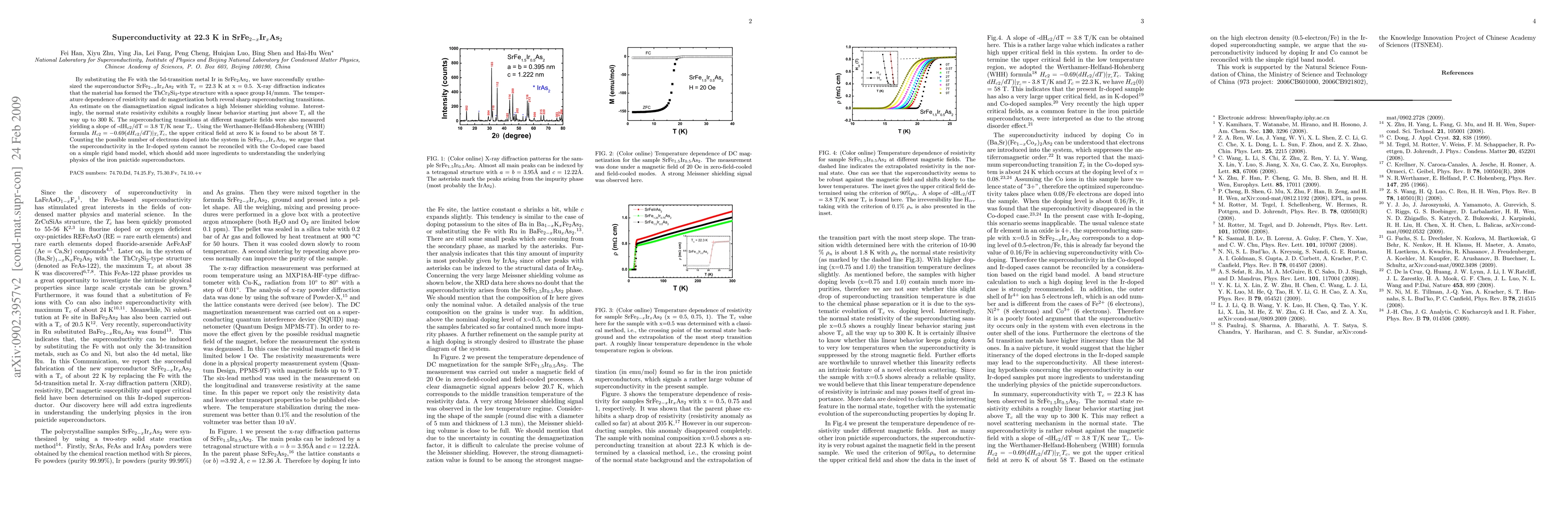 By substituting the Fe with the 5d-transition metal Ir in SrFe2As2, we have successfully synthesized the superconductor SrFe2-xIrxAs2 with Tc = 22.3 K at x = 0.5. X-ray diffraction indicates that the material has formed the ThCr2Si2-type structure with a space group I4/mmm. The temperature dependence of resistivity and dc magnetization both reveal sharp superconducting transitions at around 22 K. An estimate on the diamagnetization signal reveals a high Meissner shielding volume. Interestingly, the normal state resistivity exhibits a roughly linear behavior up to 300 K. The superconducting transitions at different magnetic fields were also measured yielding a slope of -dHc2/dT = 3.8 T/K near Tc. Using the Werthamer-Helfand-Hohenberg (WHH) formula, the upper critical field at zero K is found to be about 58 T. Counting the possible number of electrons doped into the system in SrFe2-xIrxAs2, we argue that the superconductivity in the Ir-doped system is different from the Co-doped case, which should add more ingredients to the underlying physics of the iron pnictide superconductors.