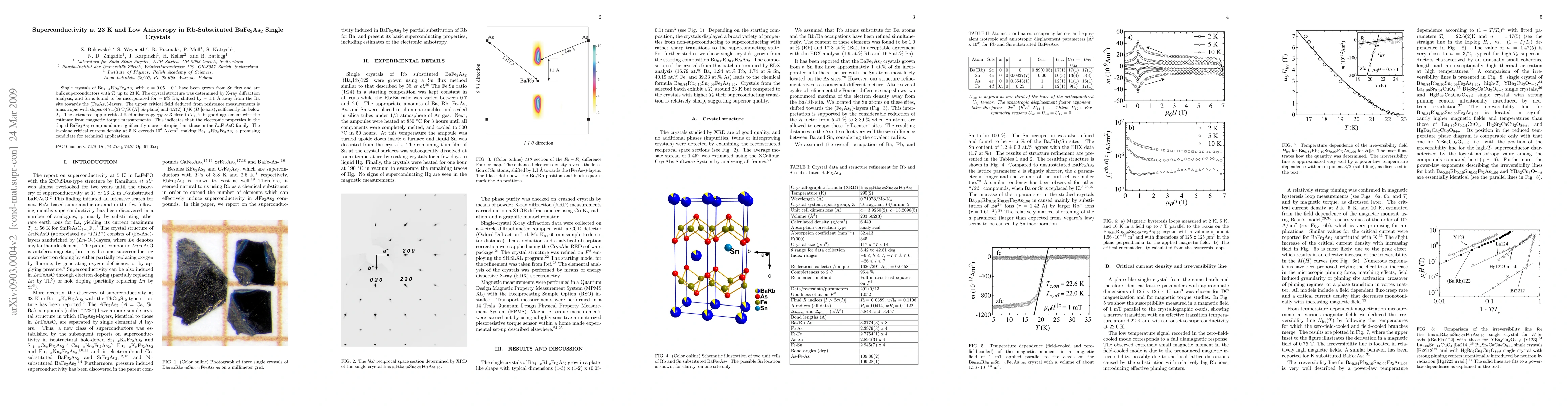 Single crystals of Ba_{1-x}Rb_{x}Fe_2As_2 with x=0.05-0.1 have been grown from Sn flux and are bulk superconductors with T_c up to 23 K. The crystal structure was determined by X-ray diffraction analysis, and Sn is found to be incorporated for 9% Ba, shifted by 1.1 Angstroem away from the Ba site towards the (Fe_2As_2)-layers. The upper critical field deduced from resistance measurements is anisotropic with slopes of 7.1(3) T/K (H || ab-plane) and 4.2(2) T/K (H || c-axis), sufficiently far below T_c. The extracted upper critical field anisotropy of 3 close to T_c, is in good agreement with the estimate from magnetic torque measurements. This indicates that the electronic properties in the doped BaFe_2As_2 compound are significantly more isotropic than those in the LnFeAsO family. The in-plane critical current density at 5 K exceeds 10^6 A/cm^2, making Ba_{1-x}Rb_xFe_2As_2 a promising candidate for technical applications.