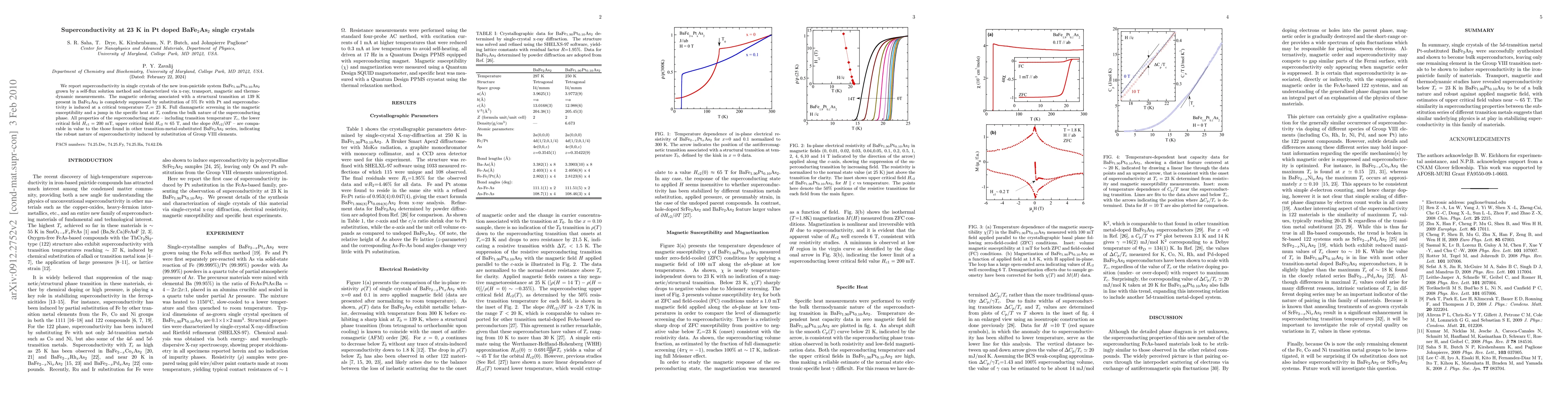 Researchers have discovered superconductivity at 23 K in Pt-doped BaFe2As2 single crystals, achieved by substituting 5% Fe with Pt. This doping suppresses magnetic ordering and induces a bulk superconducting phase, comparable to other transition-metal-substituted BaFe2As2 systems.