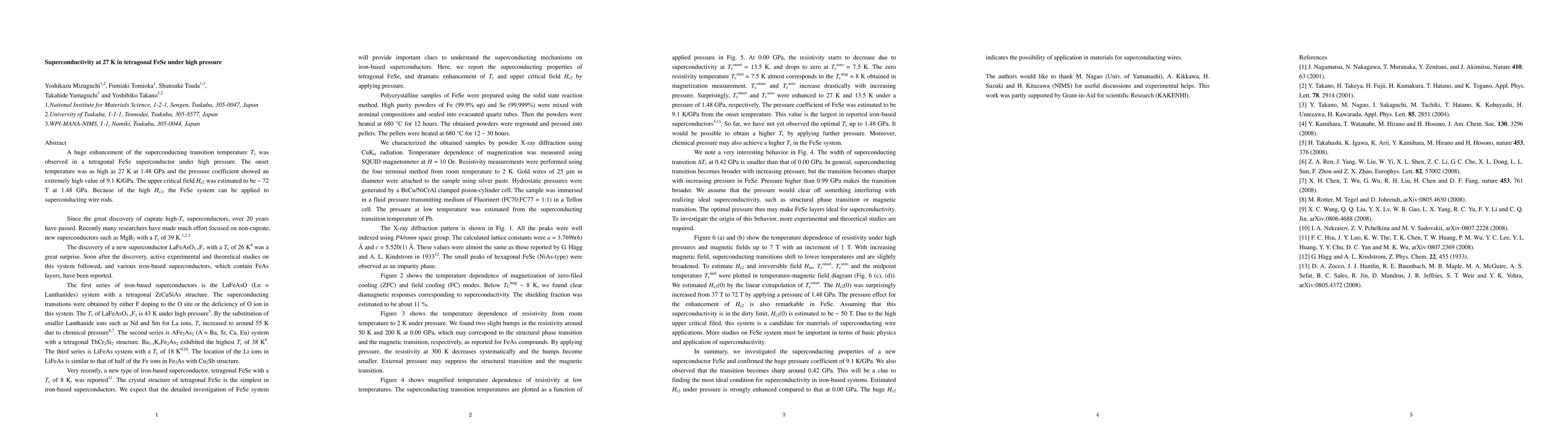 Researchers discovered that tetragonal FeSe exhibits superconductivity at a high onset temperature of 27 K under high pressure, with an impressive pressure coefficient of 9.1 K/GPa, suggesting potential for use in superconducting wire rods. This study also offers insights into the superconductivity mechanism in iron-based superconductors.