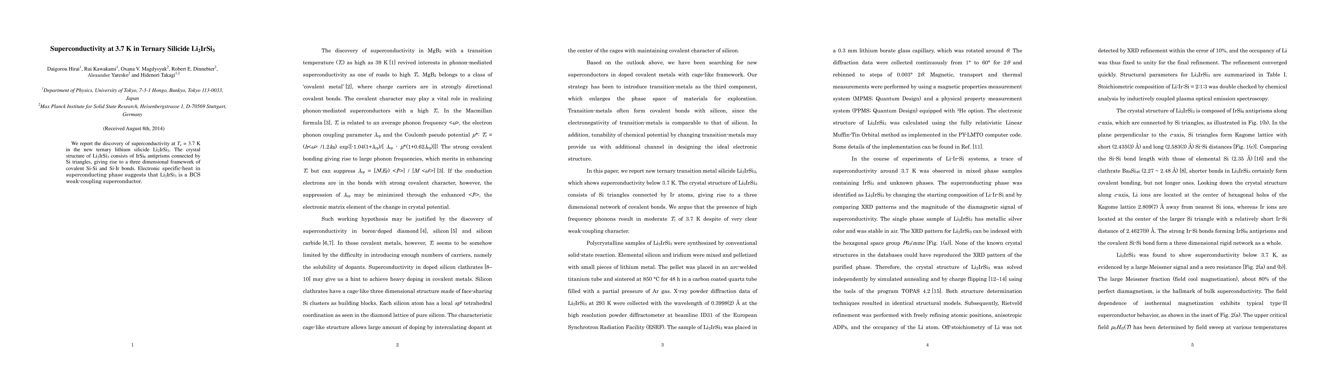 The ternary lithium silicide Li2IrSi3 exhibits superconductivity at a critical temperature of 3.7 K, characterized by a crystal structure comprising IrSi6 antiprisms and Si triangles, and is identified as a BCS weak-coupling superconductor based on electronic specific-heat measurements.