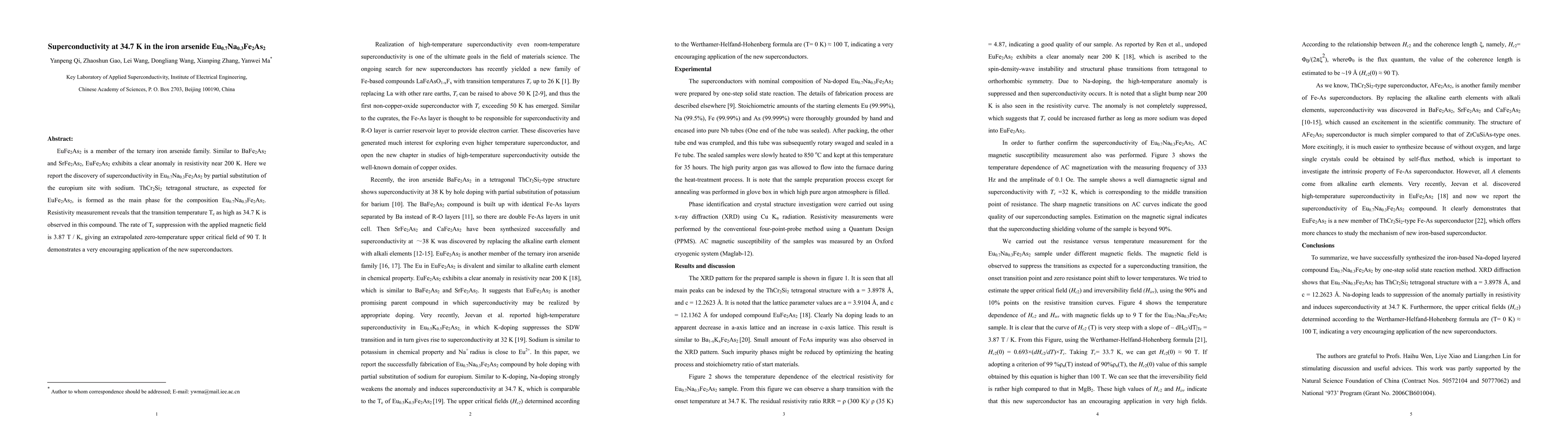 The successful synthesis of Eu0.7Na0.3Fe2As2 with a high Tc of 34.7 K and determination of its high upper critical fields (Hc2 ≈ 100 T) contribute to the understanding and development of iron-based superconductors.