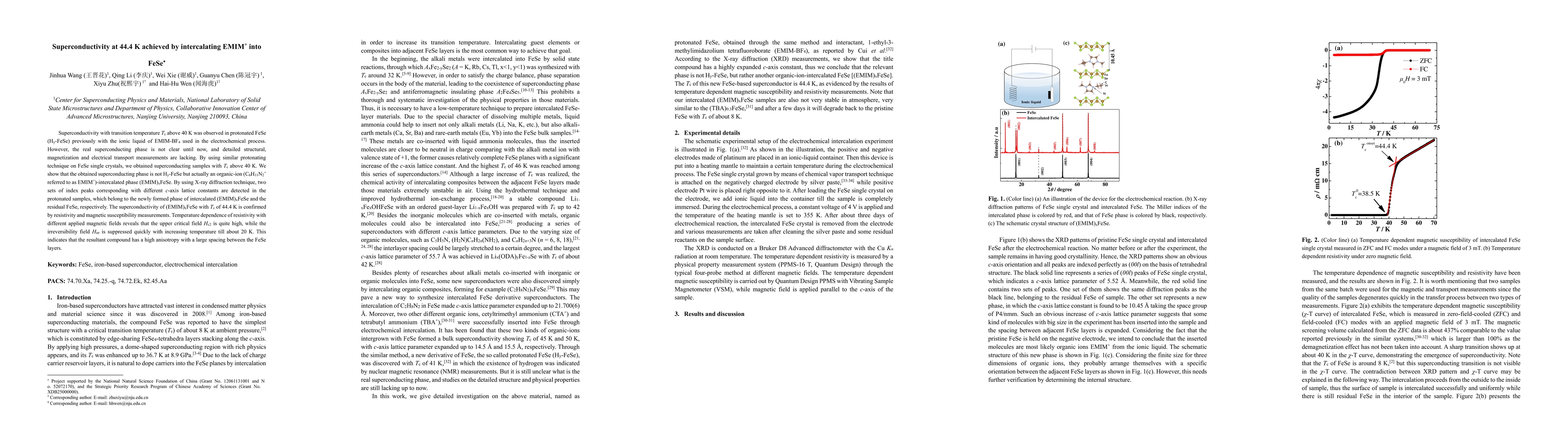 Researchers achieved superconductivity at 44.4 K in FeSe by intercalating the organic ion EMIM+ through a protonating technique, forming (EMIM)xFeSe. Detailed measurements confirm the new superconducting phase, characterized by high upper critical field and anisotropic properties.