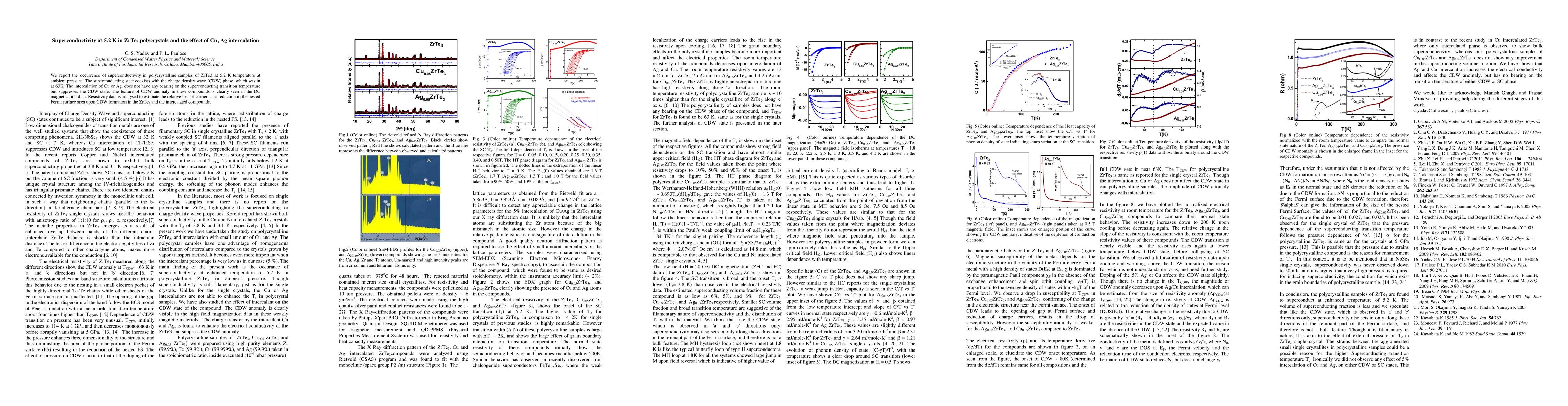 Summary: Polycrystalline ZrTe3 exhibits superconductivity at 5.2 K, coexisting with a charge density wave phase at 63 K. Intercalation of Cu or Ag suppresses the charge density wave but does not affect the superconducting transition temperature.