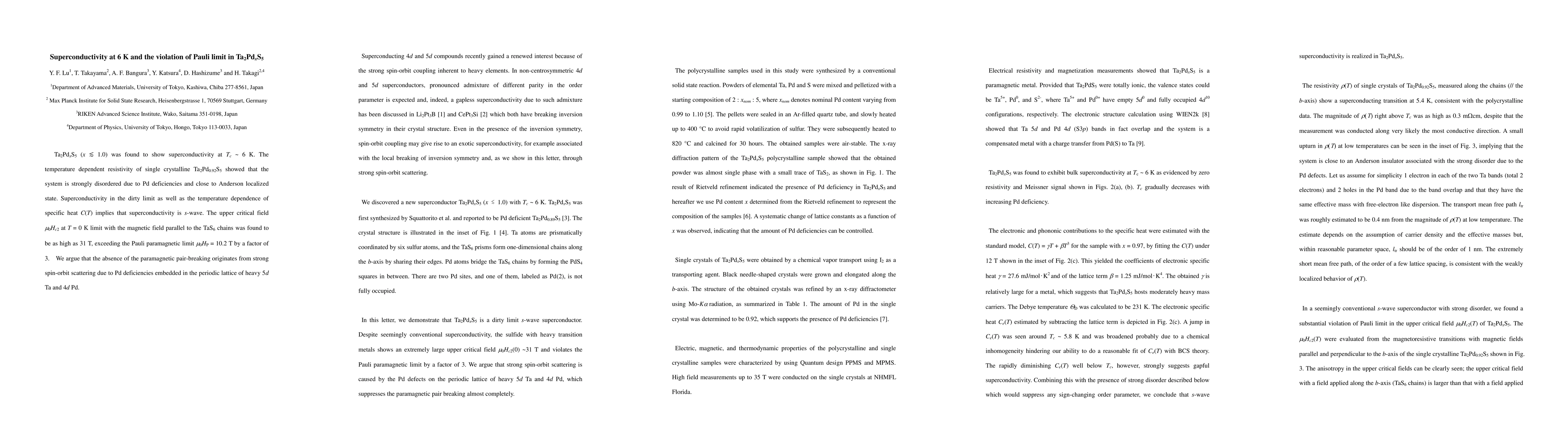 Researchers discovered superconductivity at 6 K in Ta2PdxS5, with an upper critical field exceeding the Pauli limit by a factor of 3, suggesting strong spin-orbit scattering.