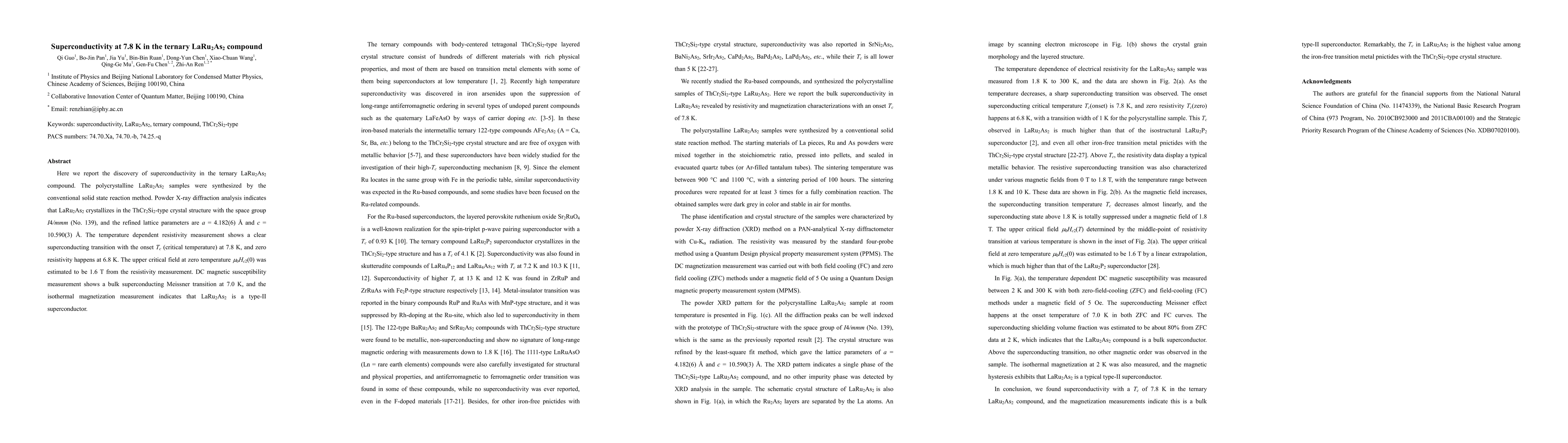 This research discovered superconductivity in the ternary LaRu2As2 compound, with a critical temperature of 7.8 K, which is higher than other iron-free transition metal pnictides.