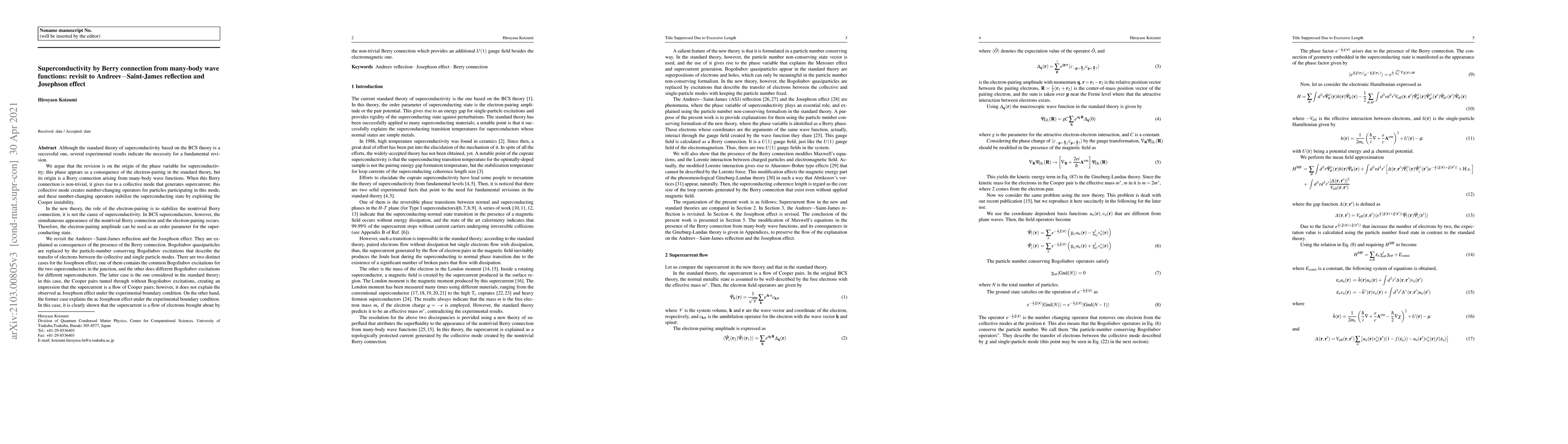 Although the standard theory of superconductivity based on the BCS theory is a successful one, several experimental results indicate the necessity for a fundamental revision. We argue that the revision is on the origin of the phase variable for superconductivity; this phase appears as a consequence of the electron-pairing in the standard theory, but its origin is a Berry connection arising from many-body wave functions. When this Berry connection is non-trivial, it gives rise to a collective mode that generates supercurrent; this collective mode creates number-changing operators for particles participating in this mode, and these number-changing operators stabilize the superconducting state by exploiting the Cooper instability. In the new theory, the role of the electron-pairing is to stabilize the nontrivial Berry connection; it is not the cause of superconductivity. In BCS superconductors, however, the simultaneous appearance of the nontrivial Berry connection and the electron-pairing occurs. Therefore, the electron-pairing amplitude can be used as an order parameter for the superconducting state. We revisit the Andreev$-$Saint-James reflection and the Josephson effect. They are explained as consequence of the presence of the Berry connection. Bogoliubov quasiparticles are replaced by the particle-number conserving Bogoliubov excitations that describe the transfer of electrons between the collective mod and single particle mode.