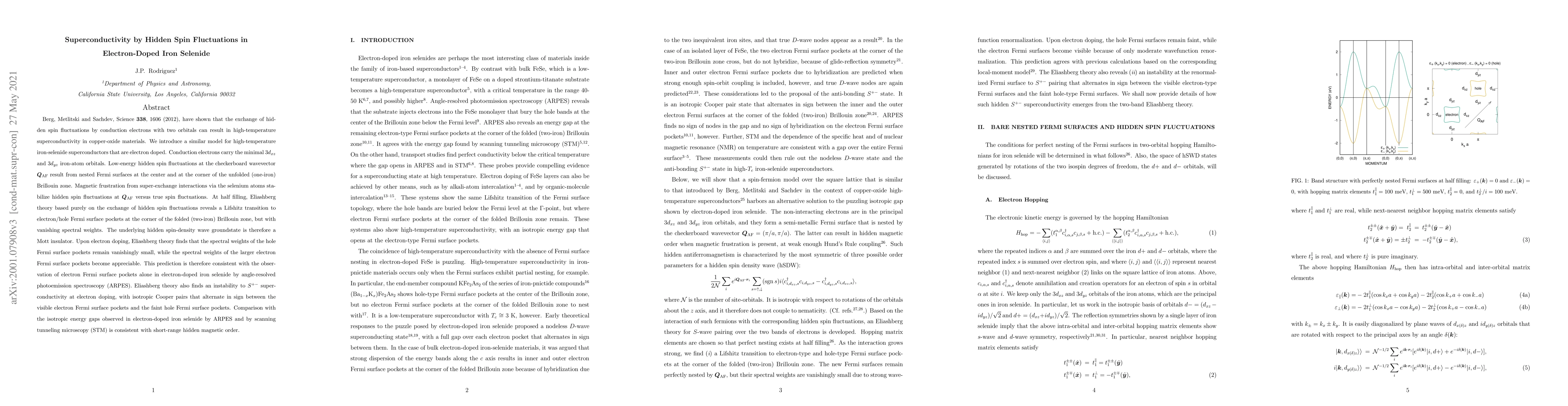 Berg, Metlitski and Sachdev, Science 338, 1606 (2012), have shown that the exchange of hidden spin fluctuations by conduction electrons with two orbitals can result in high-temperature superconductivity in copper-oxide materials. We introduce a similar model for high-temperature iron-selenide superconductors that are electron doped. Conduction electrons carry the minimal 3d xz and 3d yz iron-atom orbitals. Low-energy hidden spin fluctuations at the checkerboard wavevector Q_AF result from nested Fermi surfaces at the center and at the corner of the unfolded (one-iron) Brillouin zone. Magnetic frustration from super-exchange interactions via the selenium atoms stabilize hidden spin fluctuations at Q_AF versus true spin fluctuations. At half filling, Eliashberg theory based purely on the exchange of hidden spin fluctuations reveals a Lifshitz transition to electron/hole Fermi surface pockets at the corner of the folded (two-iron) Brillouin zone, but with vanishing spectral weights. The underlying hidden spin-density wave groundstate is therefore a Mott insulator. Upon electron doping, Eliashberg theory finds that the spectral weights of the hole Fermi surface pockets remain vanishingly small, while the spectral weights of the larger electron Fermi surface pockets become appreciable. This prediction is therefore consistent with the observation of electron Fermi surface pockets alone in electron-doped iron selenide by angle-resolved photoemission spectroscopy (ARPES). Eliashberg theory also finds an instability to S+- superconductivity at electron doping, with isotropic Cooper pairs that alternate in sign between the visible electron Fermi surface pockets and the faint hole Fermi surface pockets. Comparison with the isotropic energy gaps observed in electron-doped iron selenide by ARPES and by scanning tunneling microscopy (STM) is consistent with short-range hidden magnetic order.
