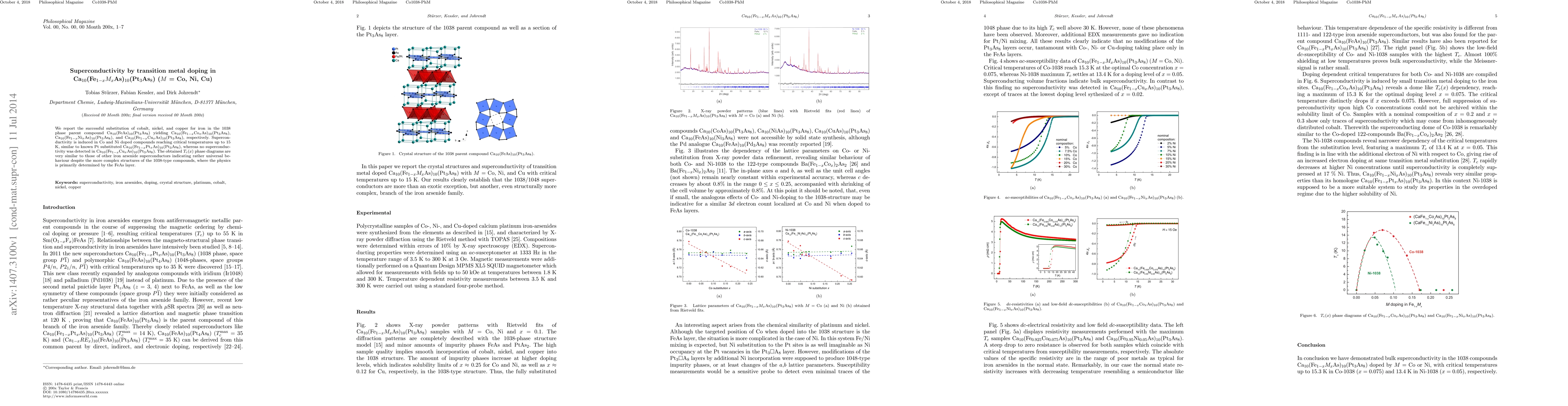 We report the successful substitution of cobalt, nickel, and copper for iron in the 1038 phase parent compound Ca$_{10}$(FeAs)$_{10}$(Pt$_3$As$_8$) yielding Ca$_{10}$(Fe$_{1-x}$Co$_x$As)$_{10}$(Pt$_3$As$_8$), Ca$_{10}$(Fe$_{1-x}$Ni$_x$As)$_{10}$(Pt$_3$As$_8$), and Ca$_{10}$(Fe$_{1-x}$Cu$_x$As)$_{10}$(Pt$_3$As$_8$), respectively. Superconductivity is induced in Co and Ni doped compounds reaching critical temperatures up to 15 K, similar to known Pt substituted Ca$_{10}$(Fe$_{1-x}$Pt$_x$As)$_{10}$(Pt$_3$As$_8$), whereas no superconductivity was detected in Ca$_{10}$(Fe$_{1-x}$Cu$_x$As)$_{10}$(Pt$_3$As$_8$). The obtained Tc(x) phase diagrams are very similar to those of other iron arsenide superconductors indicating rather universal behavior despite the more complex structures of the 1038-type compounds, where the physics is primarily determined by the FeAs layer.