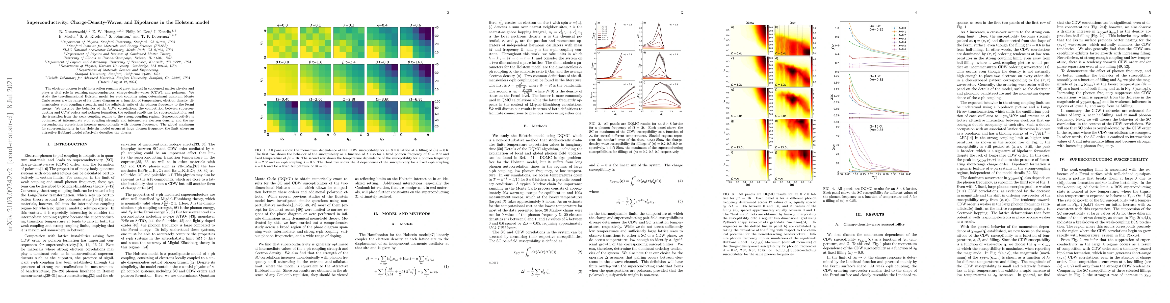 This paper investigates the Holstein model's electron-phonon interaction across various conditions, revealing optimal superconductivity at intermediate coupling and density, and highlighting the transition from weak to strong coupling regimes. The study also explores the interplay between superconductivity, charge-density-wave formation, and bipolaron behavior.