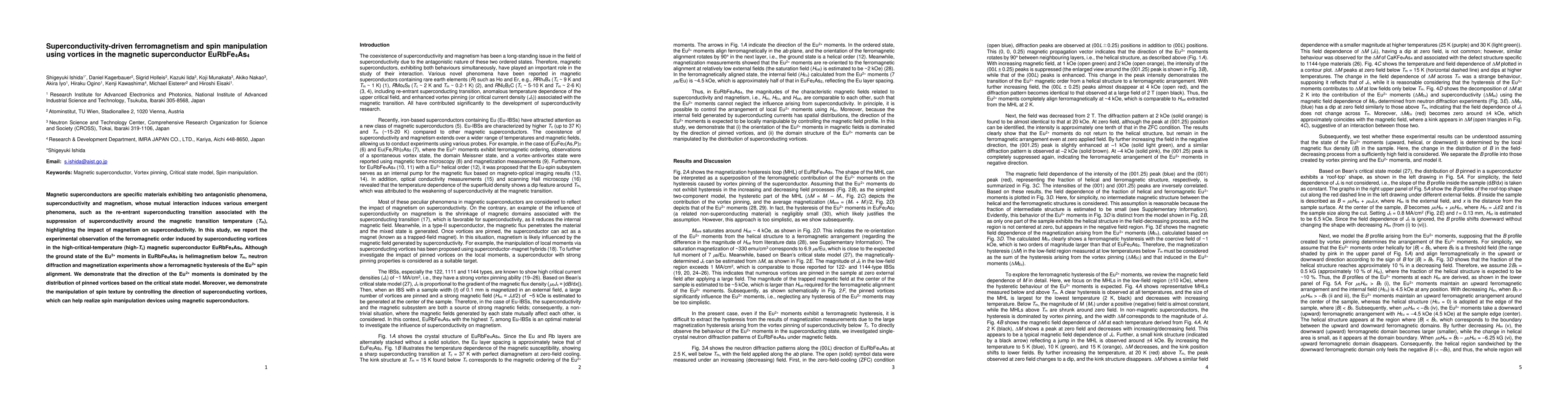 The research observes ferromagnetic order induced by superconducting vortices in the magnetic superconductor EuRbFe4As4, demonstrating spin manipulation via vortex direction control. This suggests potential for spin manipulation devices using magnetic superconductors.