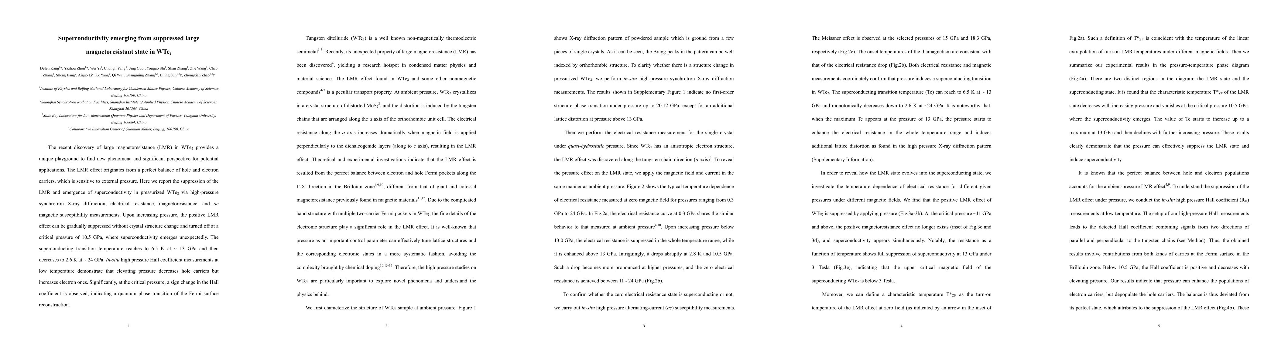 Researchers discovered superconductivity in WTe2 at high pressure, emerging from a previously suppressed large magnetoresistance state. The maximum superconducting transition temperature reached 6.5 K, with the effect changing sign at a critical pressure.