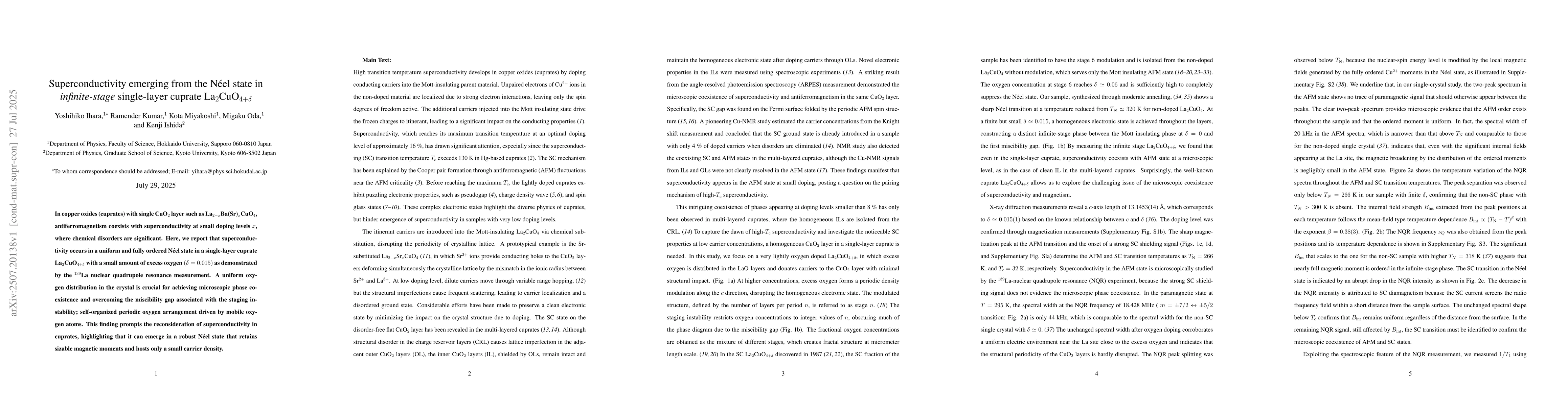 In copper oxides (cuprates) with single CuO$_2$ layer such as La$_{2-x}$Ba(Sr)$_x$CuO$_4$, antiferromagnetism coexists with superconductivity at small doping levels $x$, where chemical disorders are significant. Here, we report that superconductivity occurs in a uniform and fully ordered N${\'e}$el state in a single-layer cuprate La$_2$CuO$_{4+\delta}$ with a small amount of excess oxygen $(\delta = 0.015)$ as demonstrated by the $^{139}$La nuclear quadrupole resonance measurement. A uniform oxygen distribution in the crystal is crucial for achieving microscopic phase coexistence and overcoming the miscibility gap associated with the staging instability; self-organized periodic oxygen arrangement driven by mobile oxygen atoms. This finding prompts the reconsideration of superconductivity in cuprates, highlighting that it can emerge in a robust N${\'e}$el state that retains sizable magnetic moments and hosts only a small carrier density.