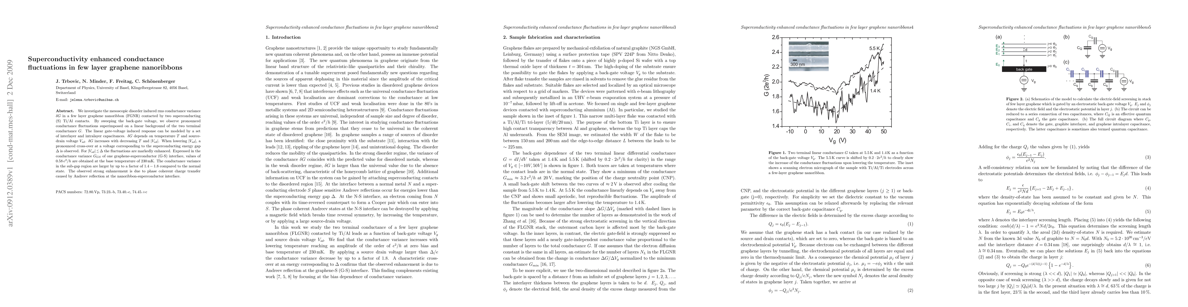 We investigate the mesoscopic disorder induced rms conductance variance $\delta G$ in a few layer graphene nanoribbon (FGNR) contacted by two superconducting (S) Ti/Al contacts. By sweeping the back-gate voltage, we observe pronounced conductance fluctuations superimposed on a linear background of the two terminal conductance G. The linear gate-voltage induced response can be modeled by a set of inter-layer and intra-layer capacitances. $\delta G$ depends on temperature T and source-drain voltage $V_{sd}$. $\delta G$ increases with decreasing T and $|V_{sd}|$. When lowering $|V_{sd}|$, a pronounced cross-over at a voltage corresponding to the superconducting energy gap $\Delta$ is observed. For $|V_{sd}|\ltequiv \Delta$ the fluctuations are markedly enhanced. Expressed in the conductance variance $G_{GS}$ of one graphene-superconducutor (G-S) interface, values of 0.58 e^2/h are obtained at the base temperature of 230 mK. The conductance variance in the sub-gap region are larger by up to a factor of 1.4-1.8 compared to the normal state. The observed strong enhancement is due to phase coherent charge transfer caused by Andreev reflection at the nanoribbon-superconductor interface.