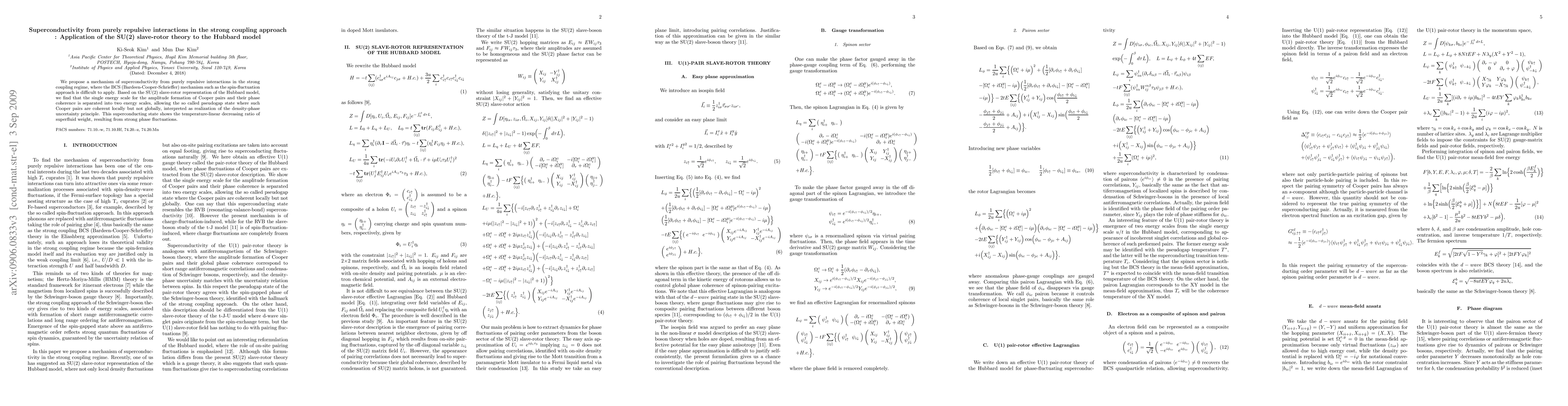 This paper proposes a mechanism for superconductivity arising from purely repulsive interactions in the strong coupling regime, using the SU(2) slave-rotor theory applied to the Hubbard model. It reveals a pseudogap state with locally coherent but not globally coherent Cooper pairs, leading to a temperature-linear decrease in superfluid weight due to strong phase fluctuations.