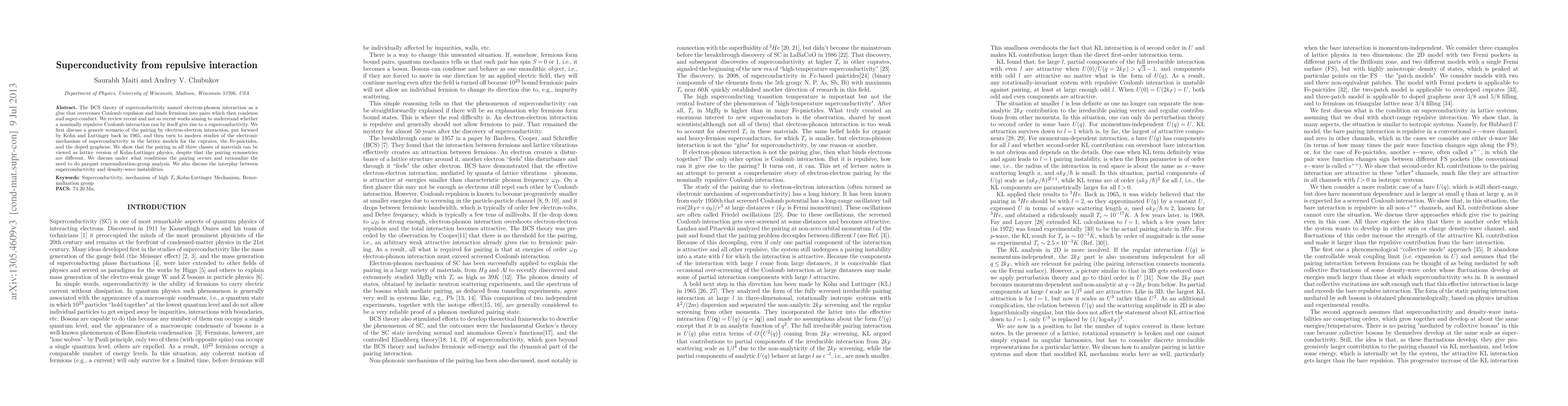 The BCS theory of superconductivity named electron-phonon interaction as a glue that overcomes Coulomb repulsion and binds fermions into pairs which then condense and superconduct. We review recent and not so recent works aiming to understand whether a nominally repulsive Coulomb interaction can by itself give rise to a superconductivity. We first discuss a generic scenario of the pairing by electron-electron interaction, put forward by Kohn and Luttinger back in 1965, and then turn to modern studies of the electronic mechanism of superconductivity in the lattice models for the cuprates, the Fe-pnictides, and the doped graphene. We show that the pairing in all three classes of materials can be viewed as lattice version of Kohn-Luttinger physics, despite that the pairing symmetries are different. We discuss under what conditions the pairing occurs and rationalize the need to do parquet renormalization-group analysis. We also discuss the interplay between superconductivity and density-instabilities.