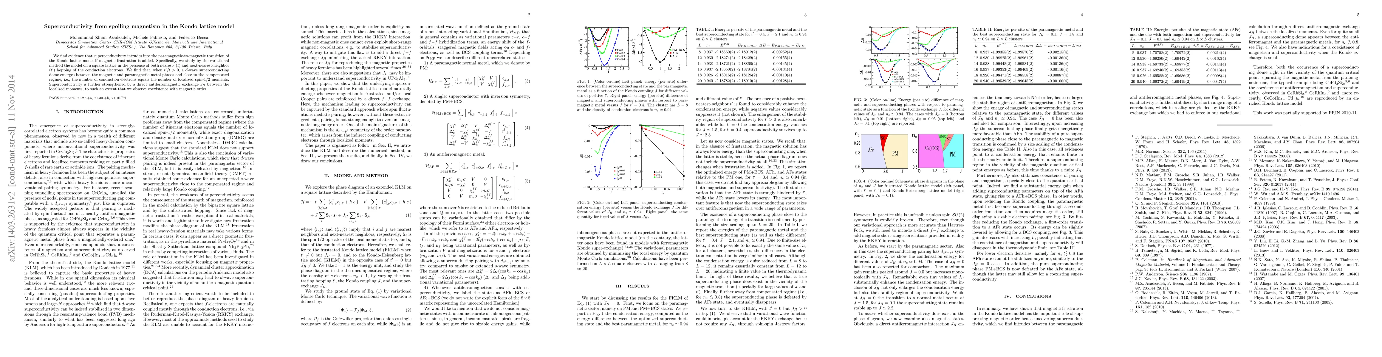 We find evidence that superconductivity intrudes into the paramagnetic-to-magnetic transition of the Kondo lattice model if magnetic frustration is added. Specifically, we study by variational method the model on a square lattice in the presence of both nearest- ($t$) and next-nearest-neighbor ($t^\prime$) hopping of the conduction electrons. We find that when $t^\prime/t$ is finite a $d$-wave superconducting dome emerges between the magnetic and paramagnetic metal phases and close to the compensated regime, i.e., the number of conduction electrons equal to the number of localized spin-1/2 moments. Superconductivity is further strengthened by a direct antiferromagnetic exchange between the localized moments, to such an extent that we even observe coexistence with magnetic order.