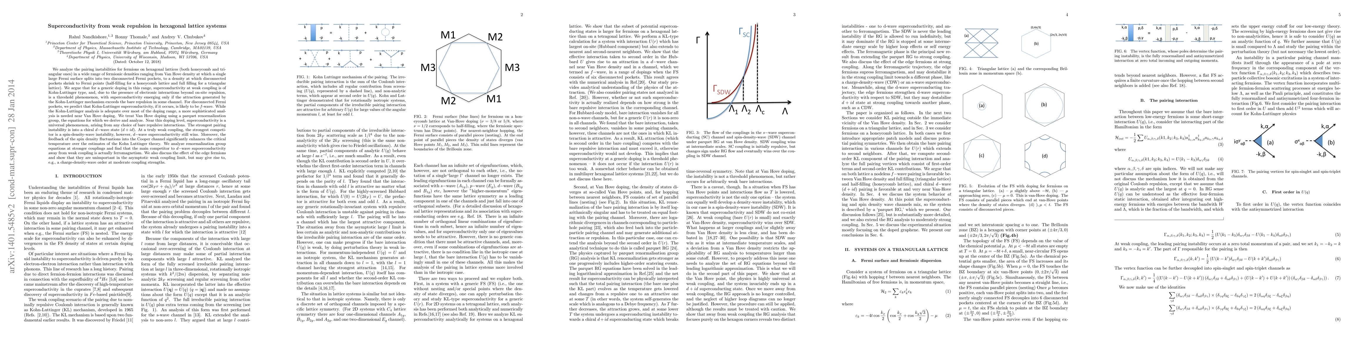This research explores superconductivity in hexagonal lattice systems, finding that superconductivity arises from weak repulsion interactions, primarily manifesting as Kohn-Luttinger pairing. Near Van Hove doping, it predicts strong $d-$wave superconductivity enhanced by spin fluctuations, while ferromagnetism becomes the main competitor at stronger couplings.