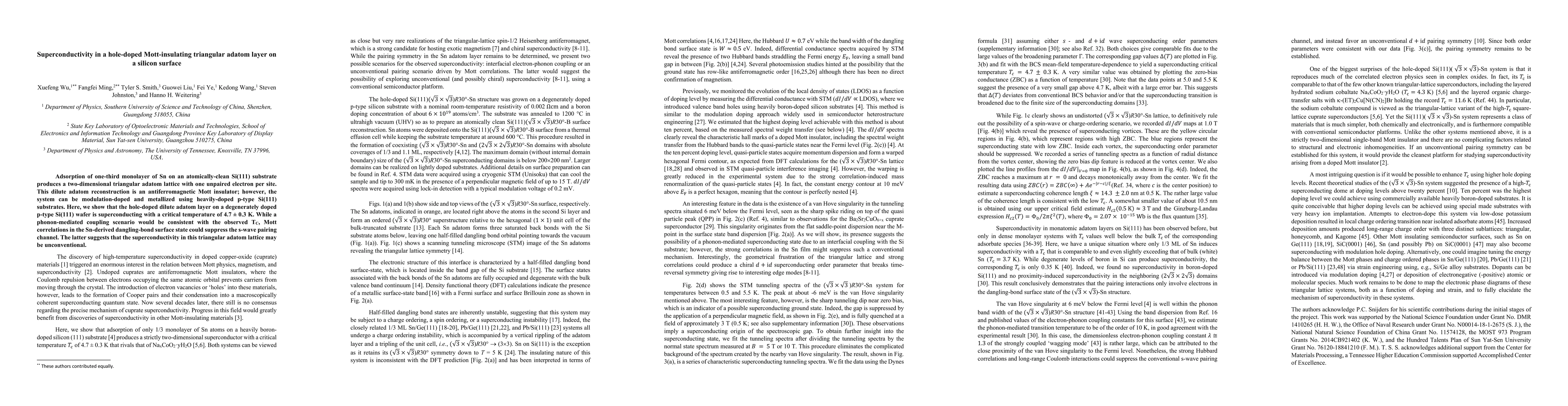 Researchers discovered superconductivity at 4.7 K in a hole-doped, two-dimensional triangular tin adatom layer on a degenerately doped p-type silicon substrate. The superconductivity might be unconventional due to possible Mott correlation effects in the tin-derived surface state.