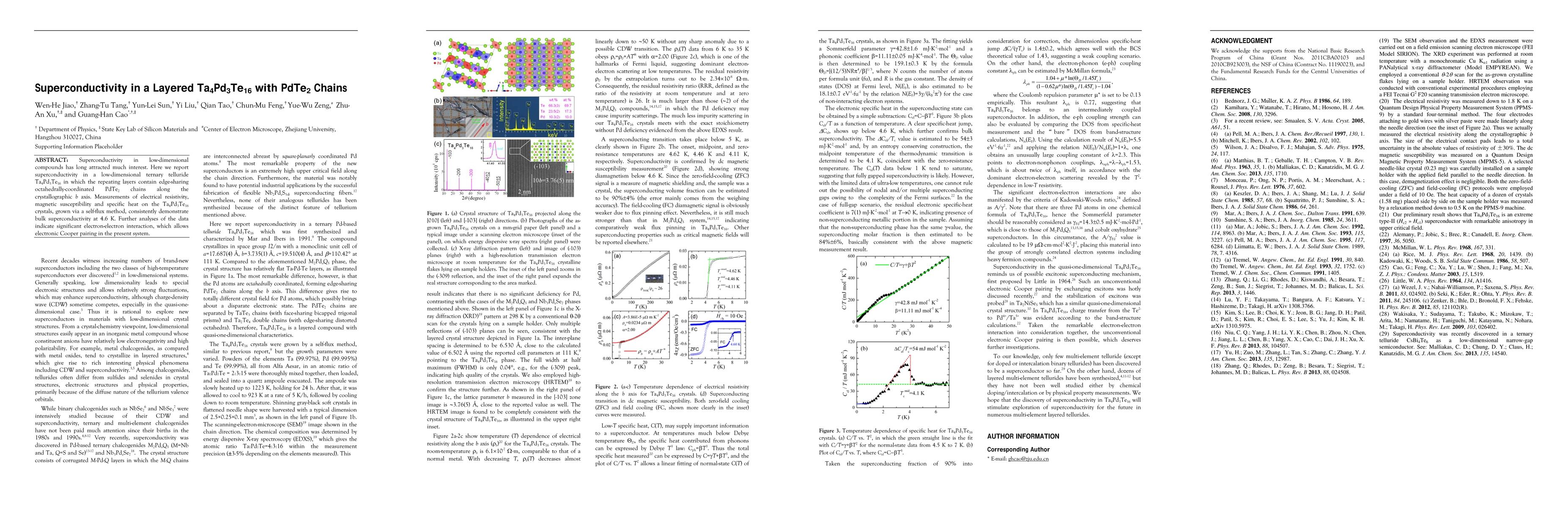 Superconductivity in low-dimensional compounds has long attracted much interest. Here we report superconductivity in a low-dimensional ternary telluride Ta4Pd3Te16 in which the repeating layers contain edge-sharing octahedrally-coordinated PdTe2 chains along the crystallographic b axis. Measurements of electrical resistivity, magnetic susceptibility and specific heat on the Ta4Pd3Te16 crystals, grown via a self-flux method, consistently demonstrate bulk superconductivity at 4.6 K. Further analyses of the data indicate significant electron-electron interaction, which allows electronic Cooper pairing in the present system.