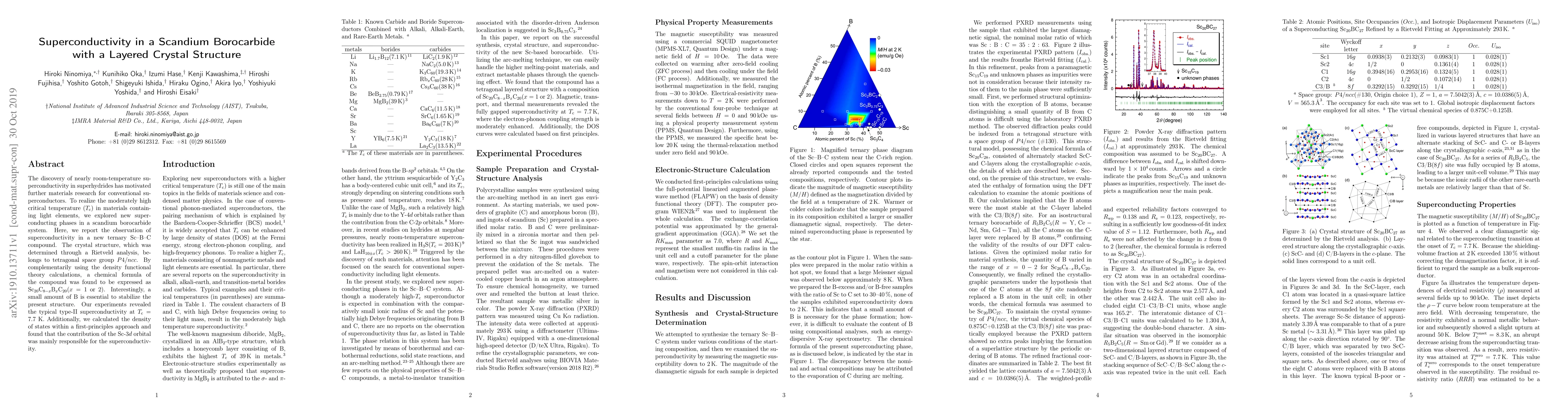 The discovery of nearly room-temperature superconductivity in superhydrides has motivated further materials research for conventional superconductors. To realize the moderately high critical temperature $(T_\mathrm{c})$ in materials containing light elements, we explored new superconducting phases in a scandium borocarbide system. Here, we report the observation of superconductivity in a new ternary Sc-B-C compound. The crystal structure, which was determined through a Rietveld analysis, belongs to tetragonal space group $P4/ncc$. By complementarily using the density functional theory calculations, a chemical formula of the compound was found to be expressed as Sc$_{20}$C$_{8-x}$B$_x$C$_{20}$($x=1\:\mathrm{or}\:2$). Interestingly, a small amount of B is essential to stabilize the present structure. Our experiments revealed the typical type-II superconductivity at $T_\mathrm{c}=7.7\:\mathrm{K}$. Additionally, we calculated the density of states within a first-principles approach and found that the contribution of the Sc-3d orbital was mainly responsible for the superconductivity.
