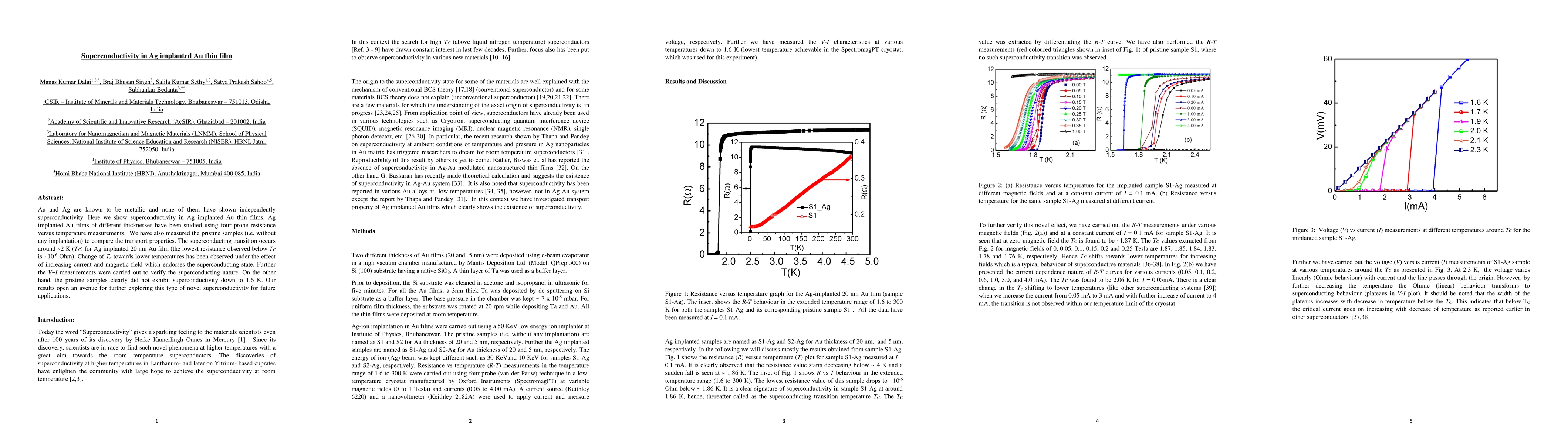 This study demonstrates superconductivity in Ag-implanted Au thin films, with a critical temperature of ~2 K, as confirmed by resistance versus temperature measurements and V~I curves. In contrast, pristine Au samples showed no superconductivity down to 1.6 K, indicating the unique superconducting properties arise from the implantation process.