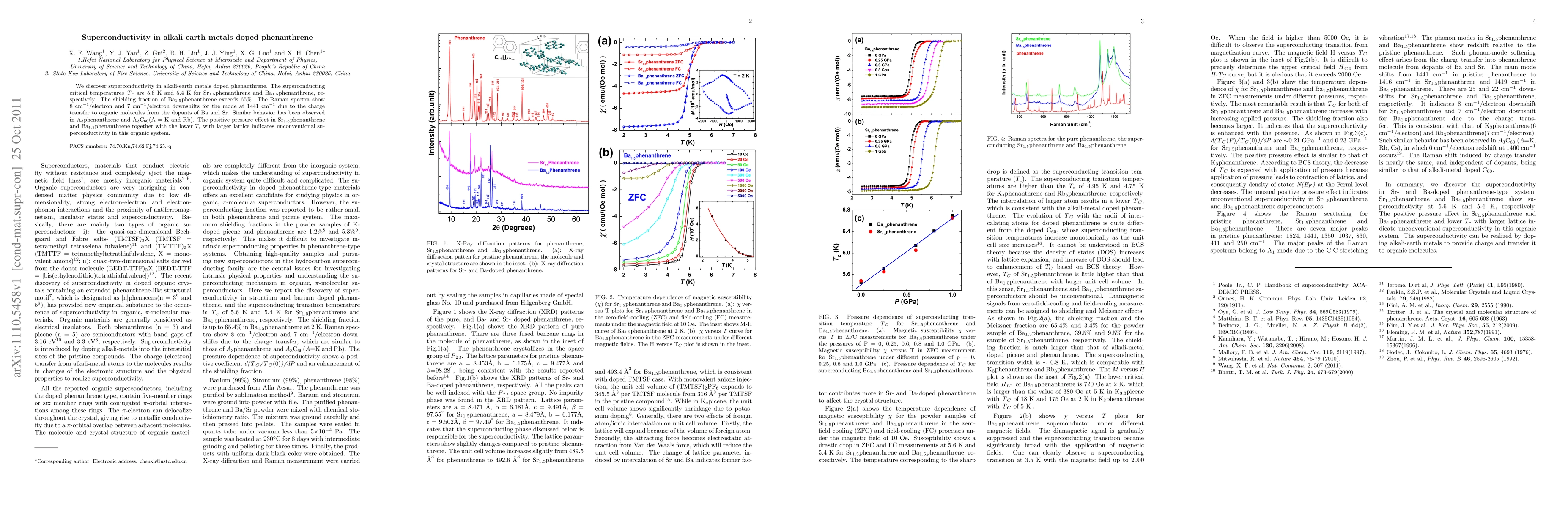 We discover superconductivity in alkali-earth metals doped phenanthrene. The superconducting critical temperatures \emph{T}$_c$ are 5.6 K and 5.4 K for Sr$_{1.5}$phenanthrene and Ba$_{1.5}$phenanthrene, respectively. The shielding fraction of Ba$_{1.5}$phenanthrene exceeds 65%. The Raman spectra show 8 cm$^{-1}$/electron and 7 cm$^{-1}$/electron downshifts for the mode at 1441 cm$^{-1}$ due to the charge transfer to organic molecules from the dopants of Ba and Sr. Similar behavior has been observed in A$_3$phenanthrene and A$_3$C$_{60}$(A = K and Rb). The positive pressure effect in Sr$_{1.5}$phenanthrene and Ba$_{1.5}$phenanthrene together with the lower $T_c$ with larger lattice indicates unconventional superconductivity in this organic system.