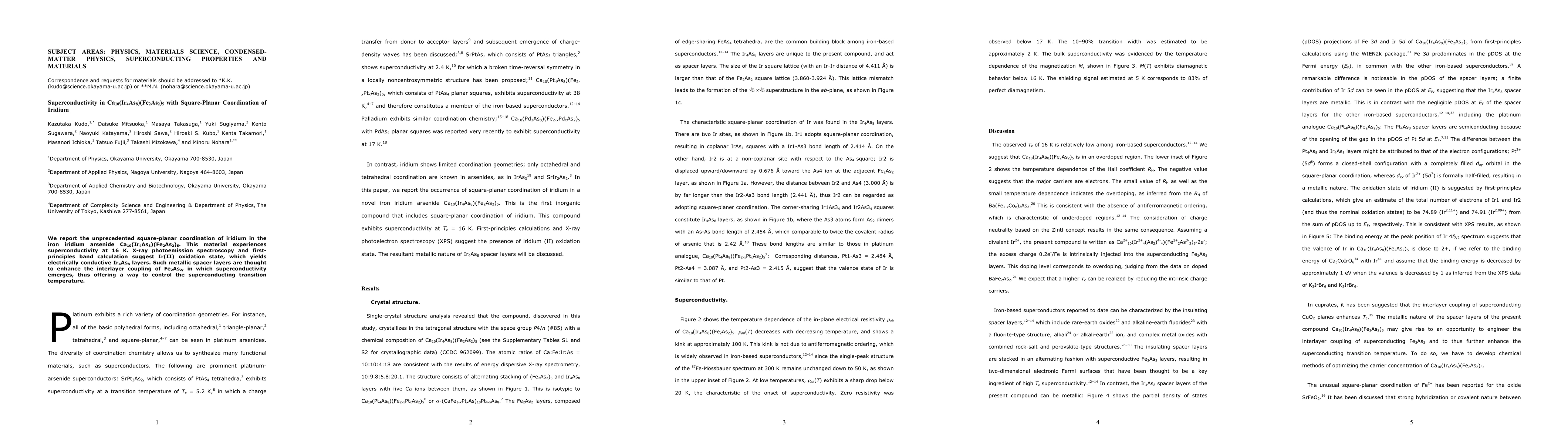 This paper reports the discovery of superconductivity at 16 K in Ca10(Ir4As8)(Fe2As2)5, featuring an unprecedented square-planar coordination of iridium. The Ir4As8 layers, with an Ir(II) oxidation state, enhance interlayer coupling in Fe2As2 layers, facilitating superconductivity.