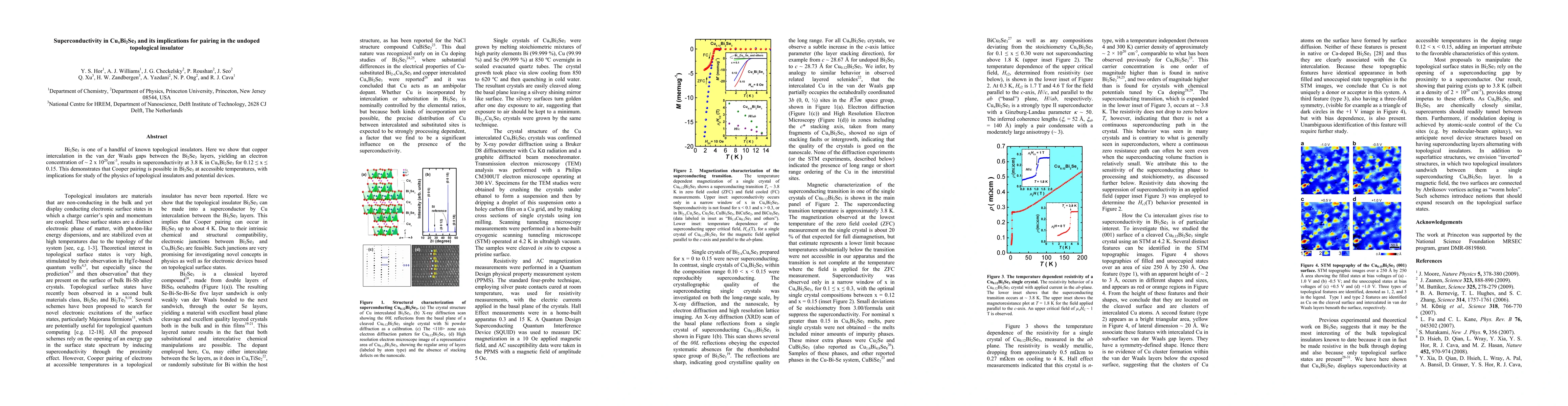 This study reveals superconductivity at 3.8 K in copper-doped Bi2Se3, indicating Cooper pairing in undoped topological insulators. This discovery holds significance for understanding topological insulator physics and developing related electronic devices.