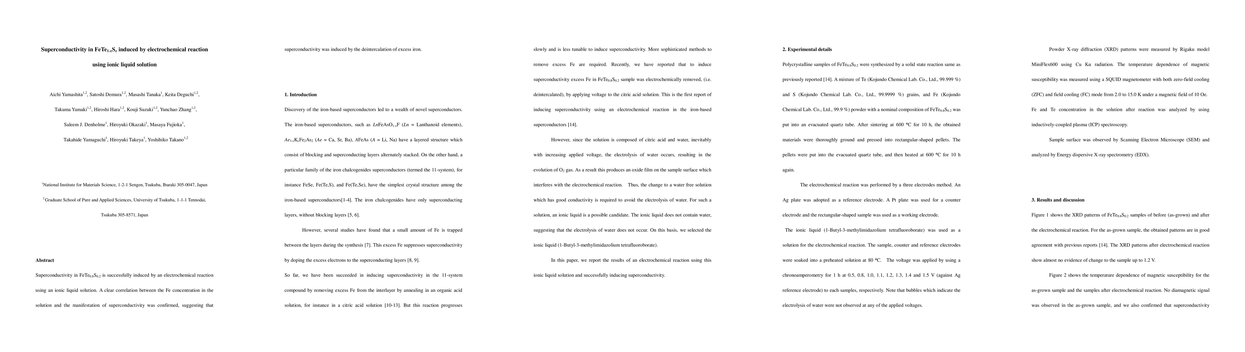 Superconductivity in FeTe0.8S0.2 is successfully induced by an electrochemical reaction using an ionic liquid solution. A clear correlation between the Fe concentration in the solution and the manifestation of superconductivity was confirmed, suggesting that superconductivity was induced by the deintercalation of excess iron.