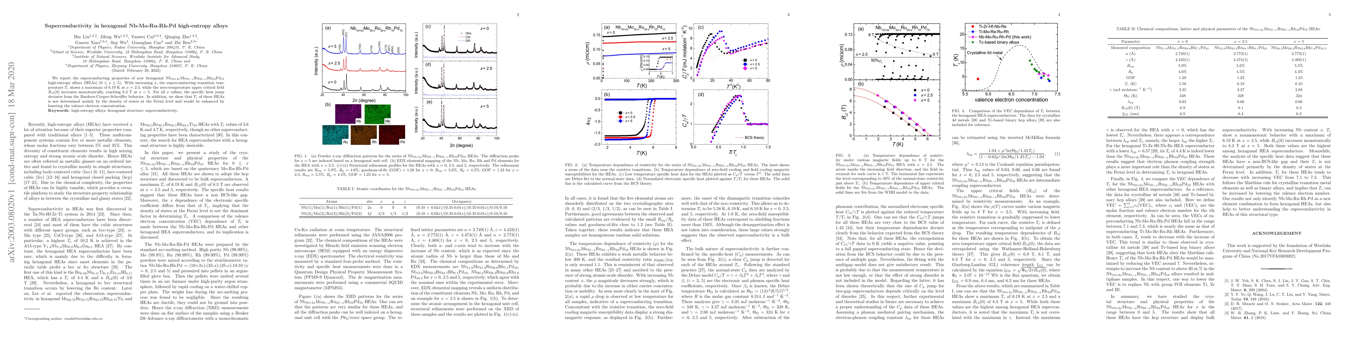 This paper investigates the superconducting properties of new hexagonal Nb-Mo-Ru-Rh-Pd high-entropy alloys, finding a peak transition temperature of 6.19 K at $x$ = 2.5, while the upper critical field increases to 8.3 T at $x$ = 5. The specific heat jump deviates from BCS behavior, suggesting $T_{\rm c}$ is enhanced by reducing the valence electron concentration rather than being primarily determined by the density of states at the Fermi level.