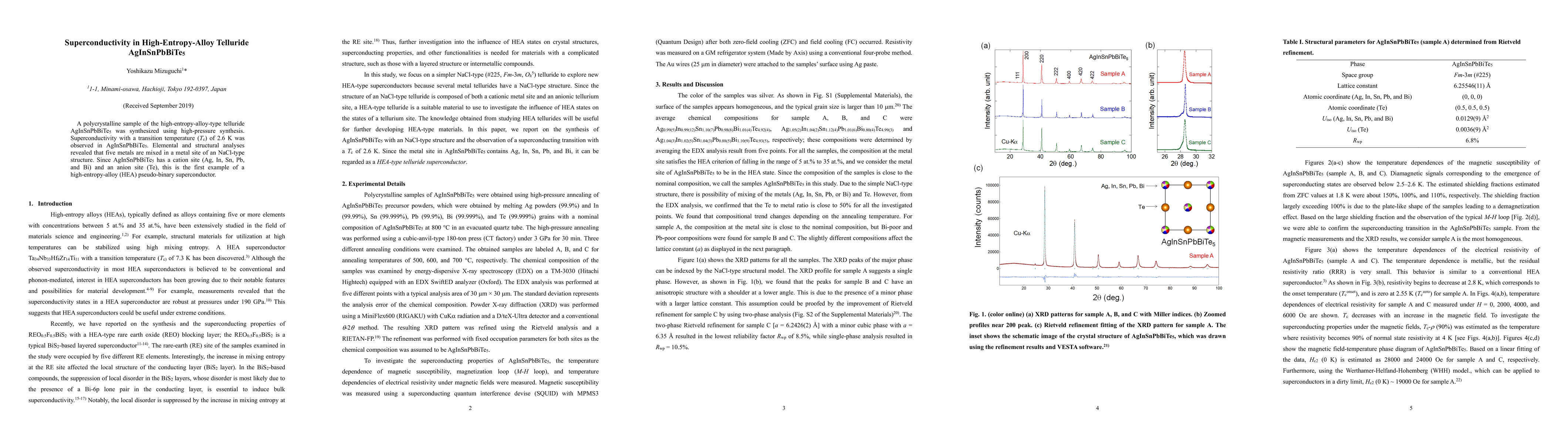 A polycrystalline sample of the high-entropy-alloy-type telluride AgInSnPbBiTe5 was synthesized using high-pressure synthesis. Superconductivity with a transition temperature (Tc) of 2.6 K was observed in AgInSnPbBiTe5. Elemental and structural analyses revealed that five metals are mixed in a metal site of an NaCl-type structure. Since AgInSnPbBiTe5 has a cation site (Ag, In, Sn, Pb, and Bi) and an anion site (Te), this is the first example of a high-entropy-alloy (HEA) pseudo-binary superconductor.