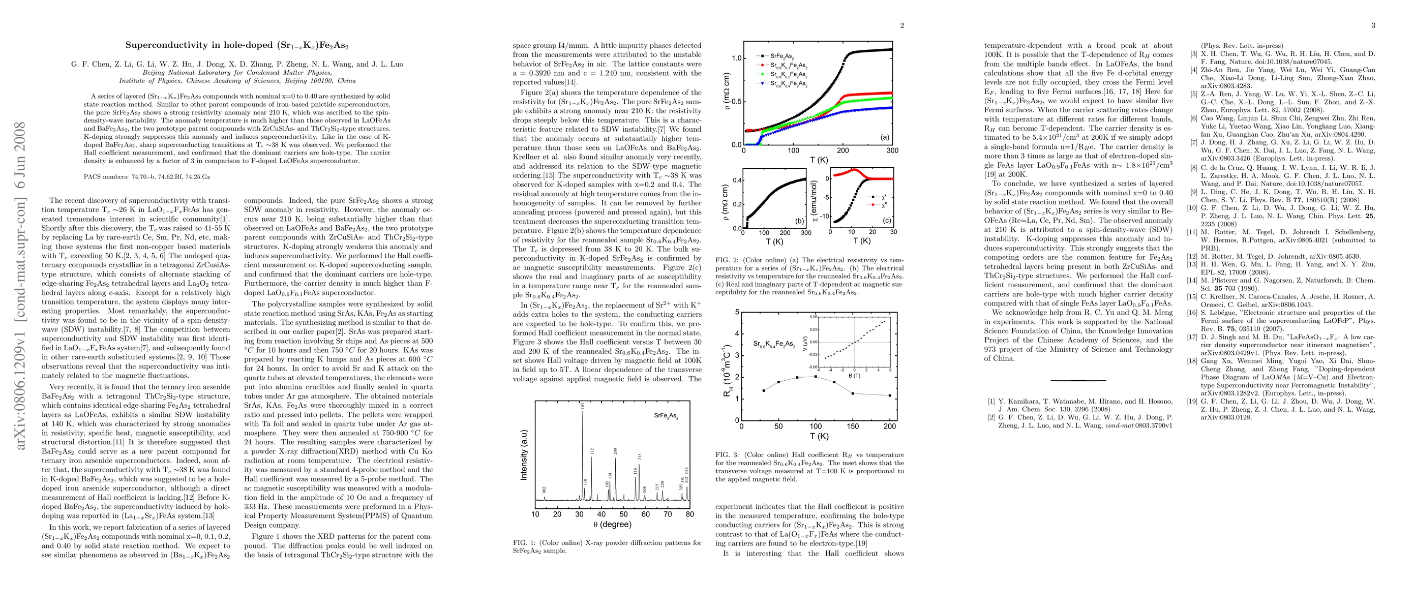 This study investigates the effects of K-doping on the superconductivity of (Sr$_{1-x}$K$_x$)Fe$_2$As$_2$ compounds, revealing that K-doping induces superconductivity with a critical temperature of T$_c\sim$38 K, while hole-type carriers dominate, as confirmed by Hall coefficient measurements.