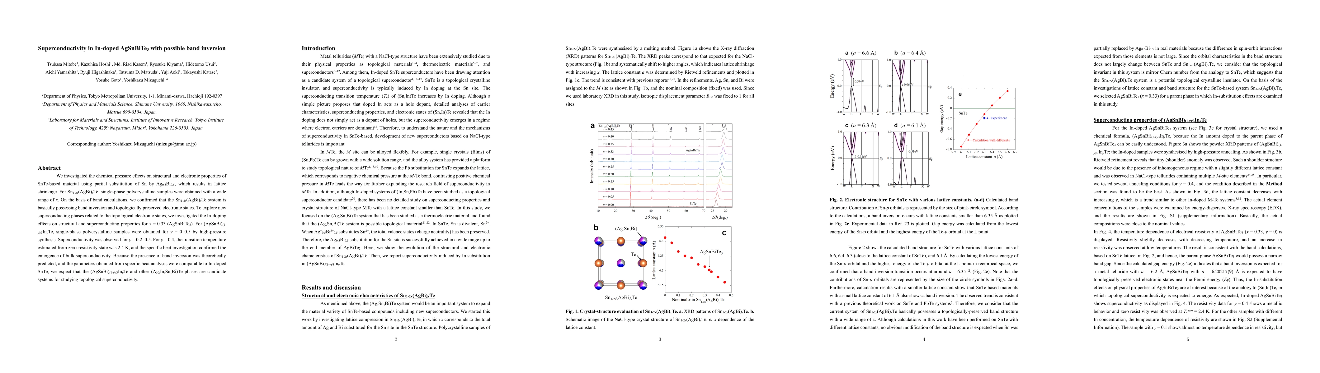 This study investigates the effects of In-doping on the superconducting properties of AgSnBiTe3, revealing superconductivity at 2.4 K for y = 0.4. The material exhibits band inversion and topologically preserved electronic states, suggesting potential for topological superconductivity.