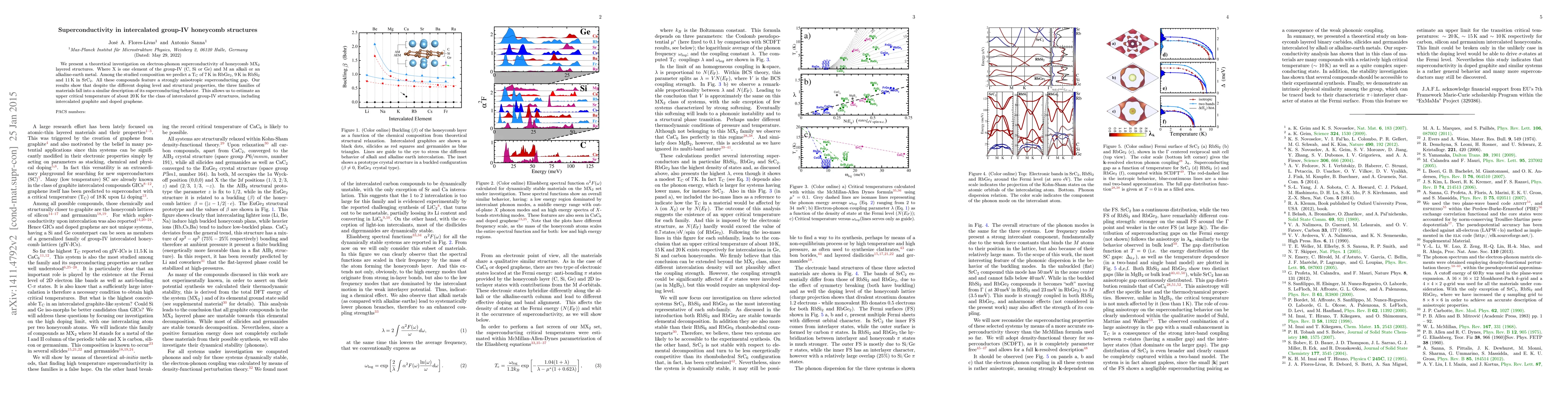 We present a theoretical investigation on electron-phonon superconductivity of honeycomb MX$_2$ layered structures. Where X is one element of the group-IV (C, Si or Ge) and M an alkali or an alkaline-earth metal. Among the studied composition we predict a $T_c$ of 7 K in RbGe$_2$, 9 K in RbSi$_2$ and 11 K in SrC$_2$. All these compounds feature a strongly anisotropic superconducting gap. Our results show that despite the different doping and structural properties, the three families of materials fall into a similar description of its superconducting behavior. This allows us to estimate an upper critical temperature of about 20 K for the class of intercalated group-IV structures, including intercalated graphite and doped graphene.