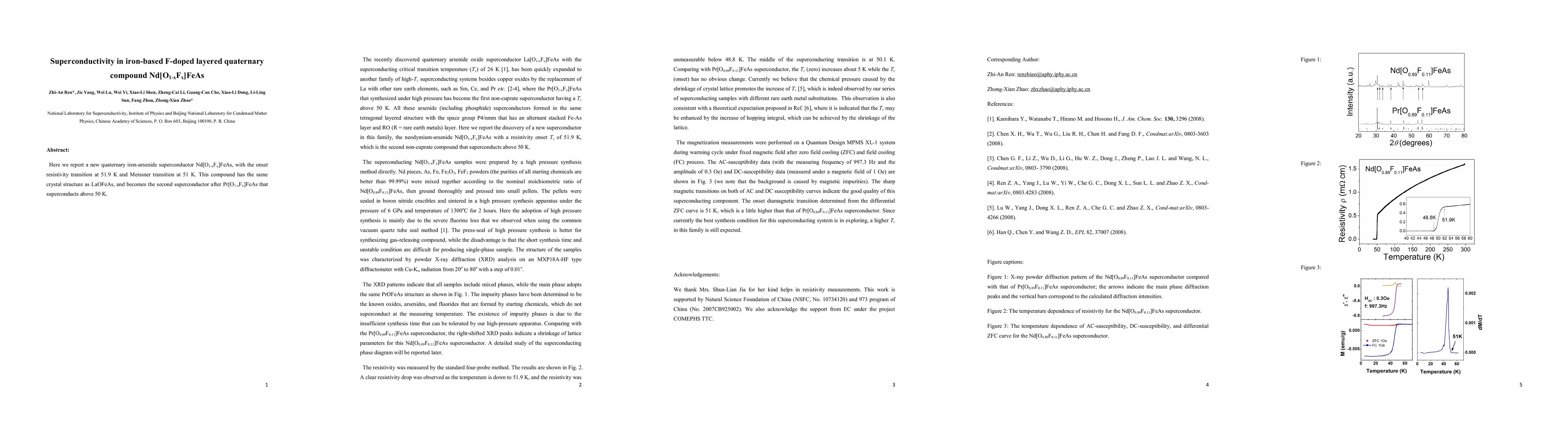 Researchers have discovered a new iron-based superconductor, Nd[O1-xFx]FeAs, with a critical transition temperature of 51.9 K, making it the second non-cuprate compound to exhibit superconductivity above 50 K.