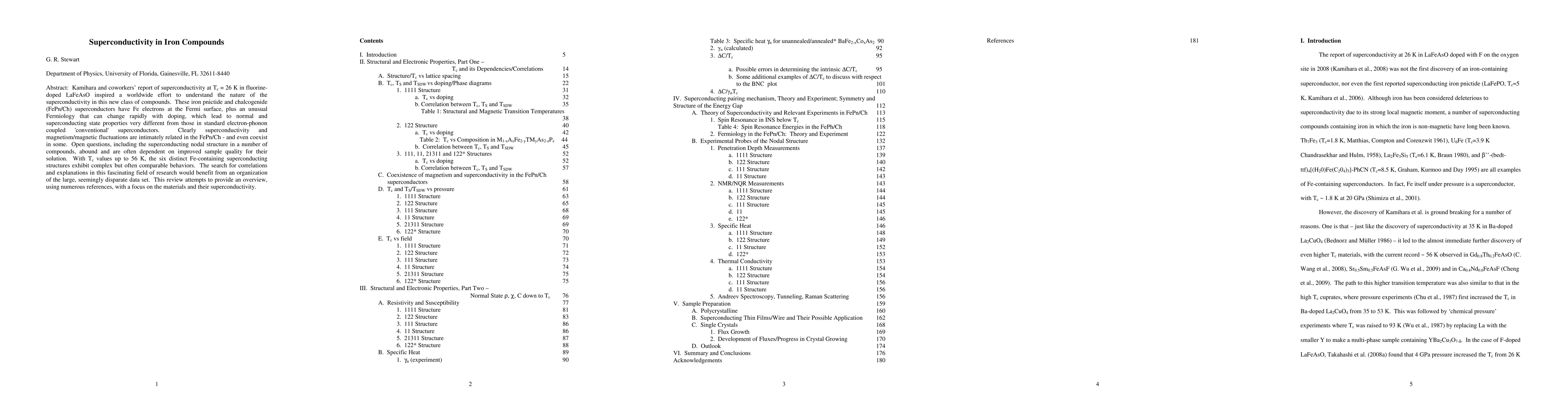 This paper reviews the groundbreaking discovery of superconductivity in fluorine-doped LaFeAsO at 26 K, highlighting the unique properties of iron pnictide and chalcogenide superconductors, which differ significantly from conventional superconductors due to their unusual Fermiology and the coexistence of superconductivity and magnetism. The review aims to organize and summarize the complex data on these Fe-containing superconducting structures, which exhibit Tc values up to 56 K.
