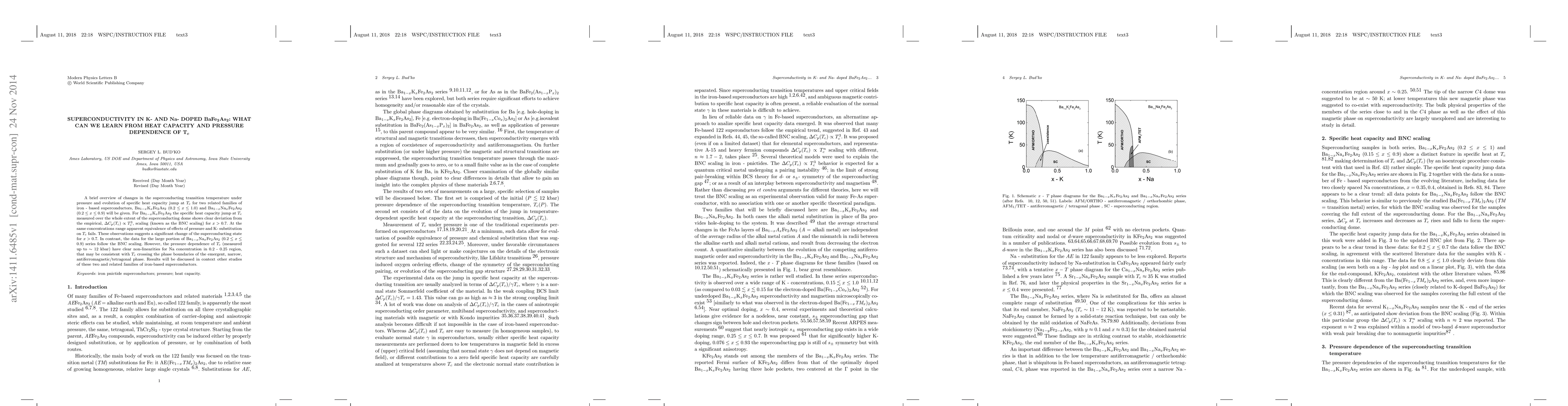 A brief overview of changes in the superconducting transition temperature under pressure and evolution of specific heat capacity jump at Tc for two related families of iron - based superconductors, Ba{1-x}KxFe2As2 (0.2 < x < 1.0) and Ba{1-x}NaxFe2As2 (0.2 < x < 0.9) will be given. For Ba{1-x}KxFe2As2 the specific heat capacity jump at Tc measured over the whole extent of the superconducting dome shows clear deviation from the empirical, Delta Cp (Tc) ~ Tc^3, scaling (known as the BNC scaling) for x > 0.7. At the same concentrations range apparent equivalence of effects of pressure and K- substitution on Tc fails. These observations suggests a significant change of the superconducting state for x > 0.7. In contrast, the data for the large portion of Ba{1-x}NaxFe2As2 (0.2 < x < 0.9) series follow the BNC scaling. However, the pressure dependence of Tc (measured up to ~ 12 kbar) have clear non-linearities for Na concentration in 0.2 - 0.25 region, that may be consistent with Tc crossing the phase boundaries of the emergent, narrow, antiferromagnetic/tetragonal phase. Results will be discussed in context other studies of these two and related families of iron-based superconductors.