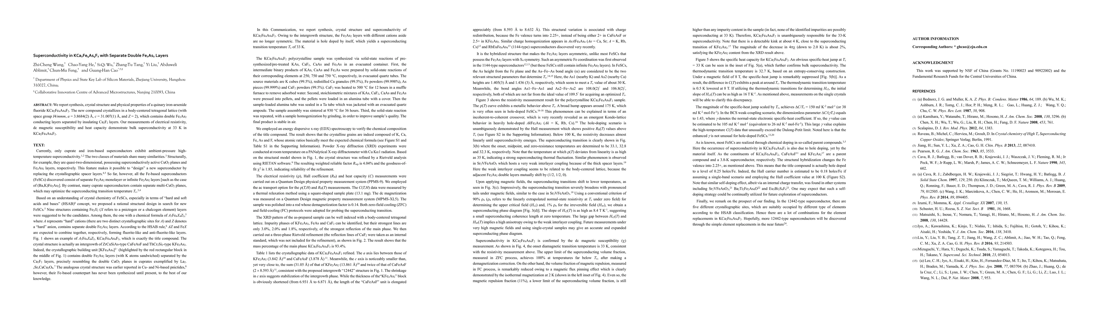 The paper reports the synthesis and crystal structure of KCa$_2$Fe$_4$As$_4$F$_2$, an iron-arsenide fluoride with superconducting properties. The compound exhibits bulk superconductivity at 33 K and contains insulating Ca$_2$F$_2$ layers separating its conducting double Fe$_2$As$_2$ layers.