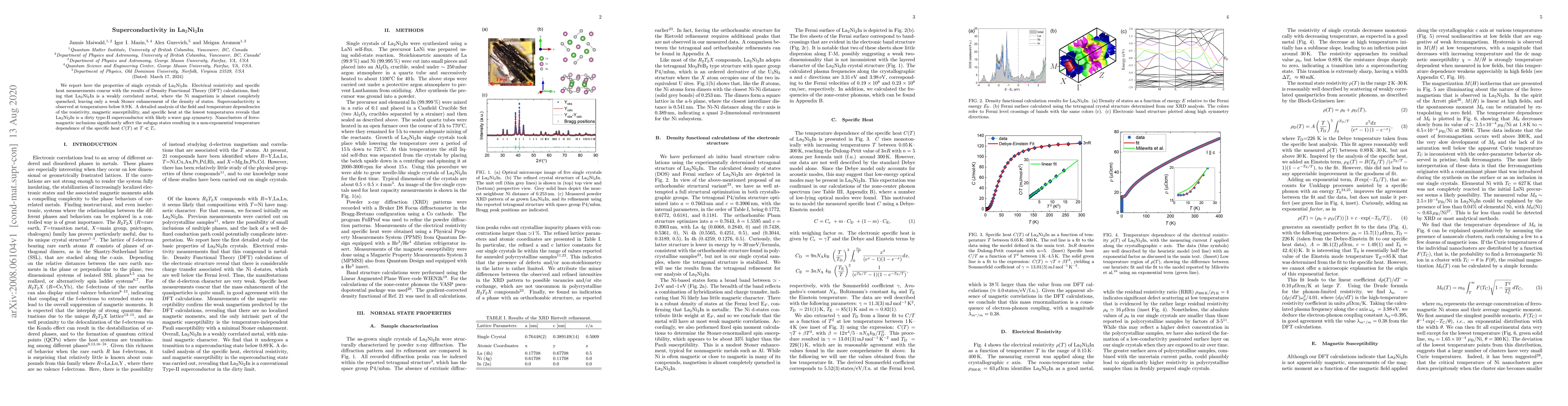 We report here the properties of single crystals of La$_2$Ni$_2$In. Electrical resistivity and specific heat measurements concur with the results of Density Functional Theory (DFT) calculations, finding that La$_{2}$Ni$_{2}$In is a weakly correlated metal, where the Ni magnetism is almost completely quenched, leaving only a weak Stoner enhancement of the density of states. Superconductivity is observed at temperatures below 0.9$\,$K. A detailed analysis of the field and temperature dependencies of the resistivity, magnetic susceptibility, and specific heat at the lowest temperatures reveals that La$_2$Ni$_2$In is a dirty type-II superconductor with likely s-wave gap symmetry. Nanoclusters of ferromagnetic inclusions significantly affect the subgap states resulting in a non-exponential temperature dependence of the specific heat $C(T)$ at $T\ll T_\text{c}$.