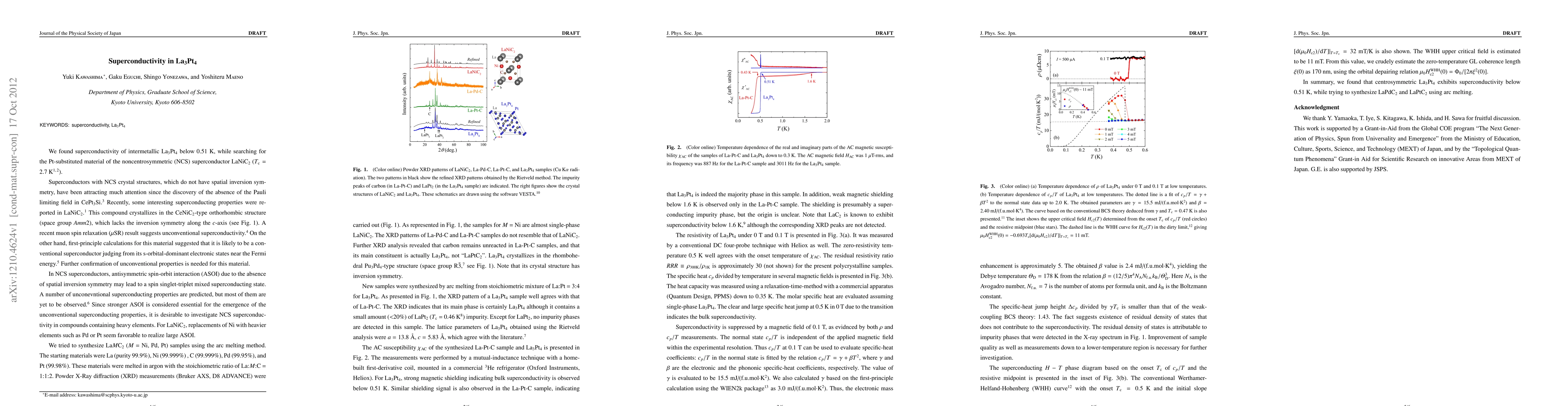 We found superconductivity of intermetallic La$_3$Pt$_4$ below 0.51 K, while searching for the Pt-substituted material of the noncentrosymmetric (NCS) superconductor LaNiC$_2$ ($T_{\rm{c}}=2.7$ K.