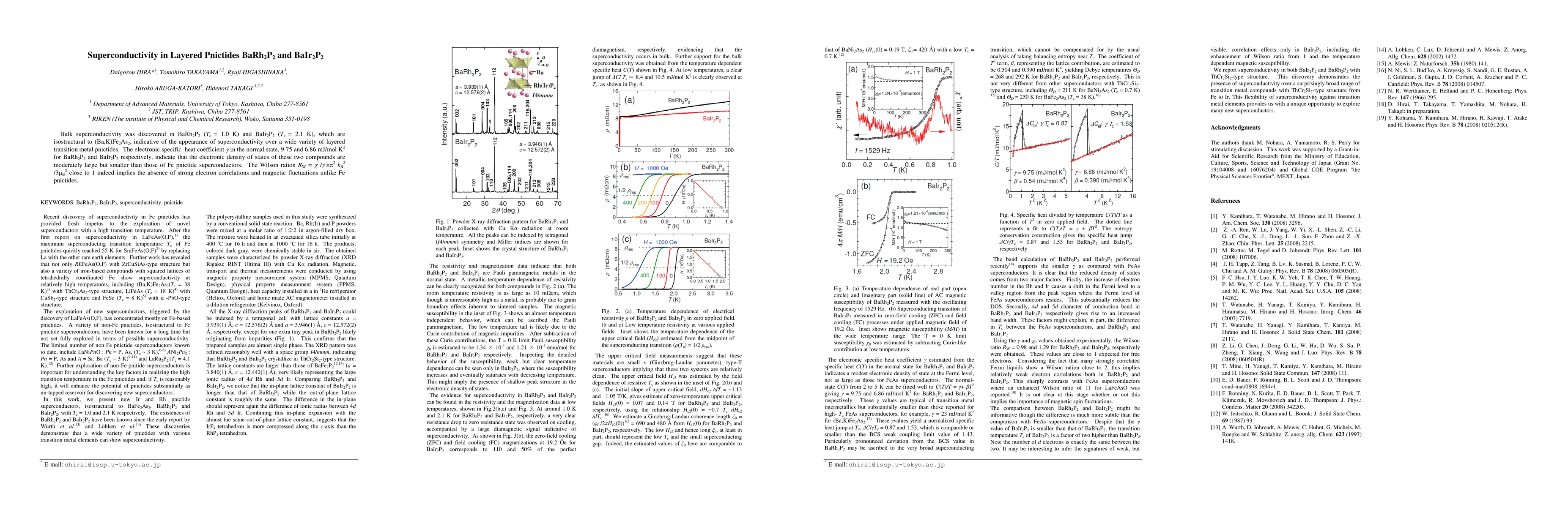 This paper reports the discovery of bulk superconductivity in the layered pnictides BaRh2P2 (Tc = 1.0 K) and BaIr2P2 (Tc = 2.1 K), expanding the range of superconducting transition metal pnictides. The electronic density of states is moderately large but smaller than in Fe pnictides, and the Wilson ratio suggests weak electron correlations and magnetic fluctuations.