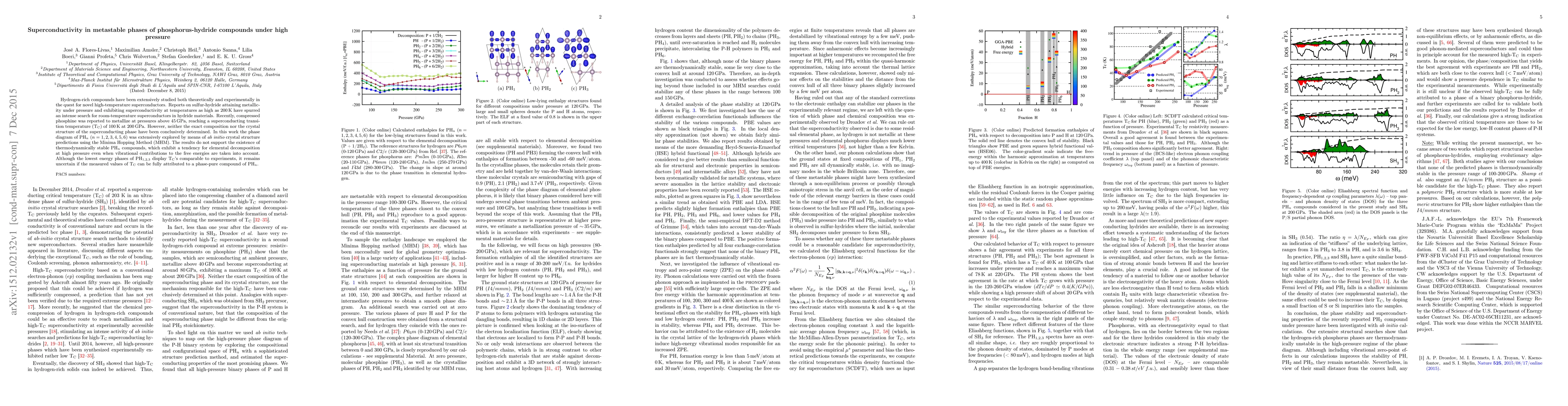 Hydrogen-rich compounds have been extensively studied both theoretically and experimentally in the quest for novel high-temperature superconductors. Reports on sulfur-hydride attaining metallicity under pressure and exhibiting superconductivity at temperatures as high as 200 K have spurred an intense search for room-temperature superconductors in hydride materials. Recently, compressed phosphine was reported to metallize at pressures above 45 GPa, reaching a superconducting transition temperature (T$_{c}$) of 100 K at 200 GPa. However, neither the exact composition nor the crystal structure of the superconducting phase have been conclusively determined. In this work the phase diagram of PH$_n$ ($n=1,2,3,4,5,6$) was extensively explored by means of {\it ab initio} crystal structure predictions using the Minima Hopping Method (MHM). The results do not support the existence of thermodynamically stable PH$_n$ compounds, which exhibit a tendency for elemental decomposition at high pressure even when vibrational contributions to the free energies are taken into account. Although the lowest energy phases of PH$_{1,2,3}$ display T$_{c}$'s comparable to experiments, it remains uncertain if the measured values of T$_{c}$ can be fully attributed to a phase-pure compound of PH$_n$.